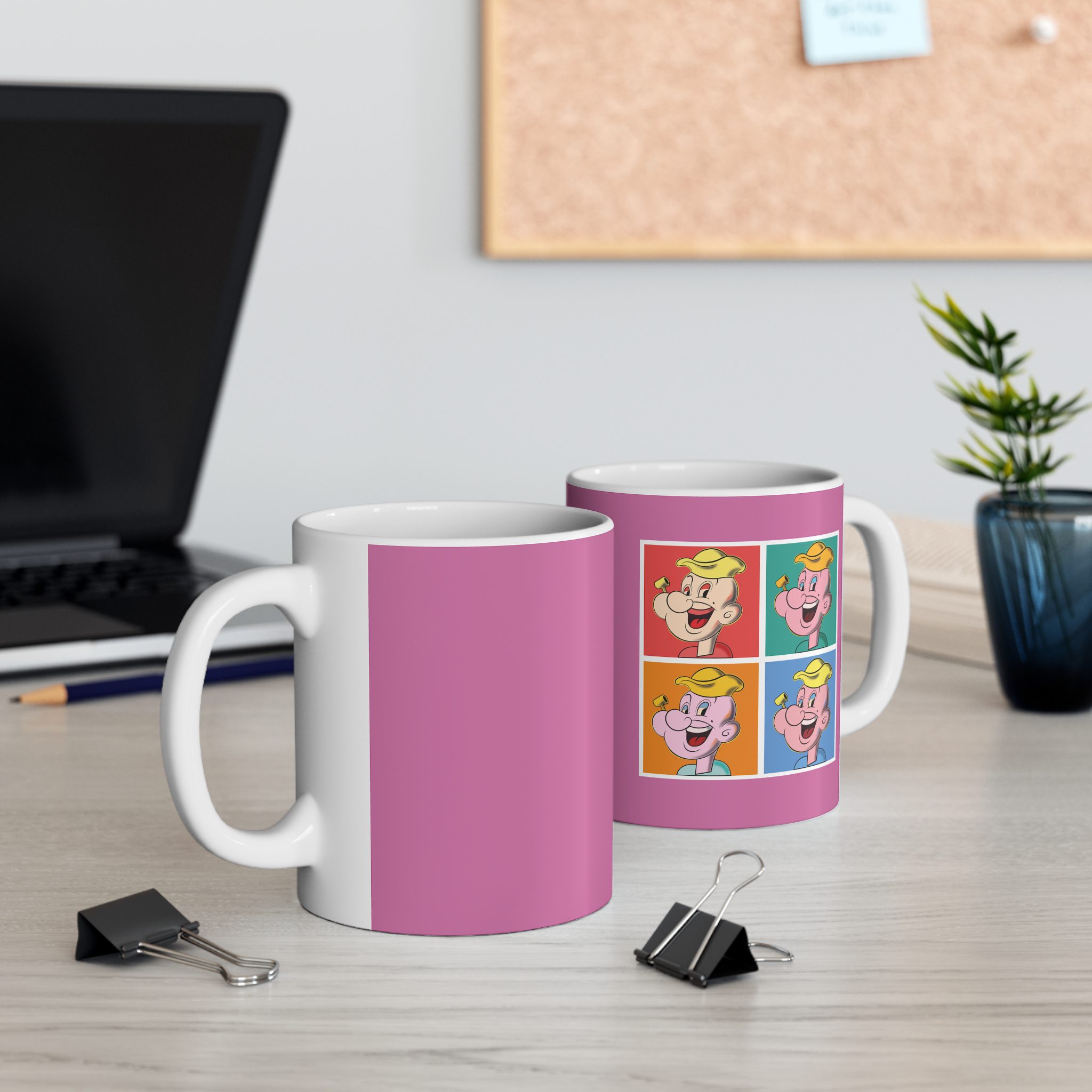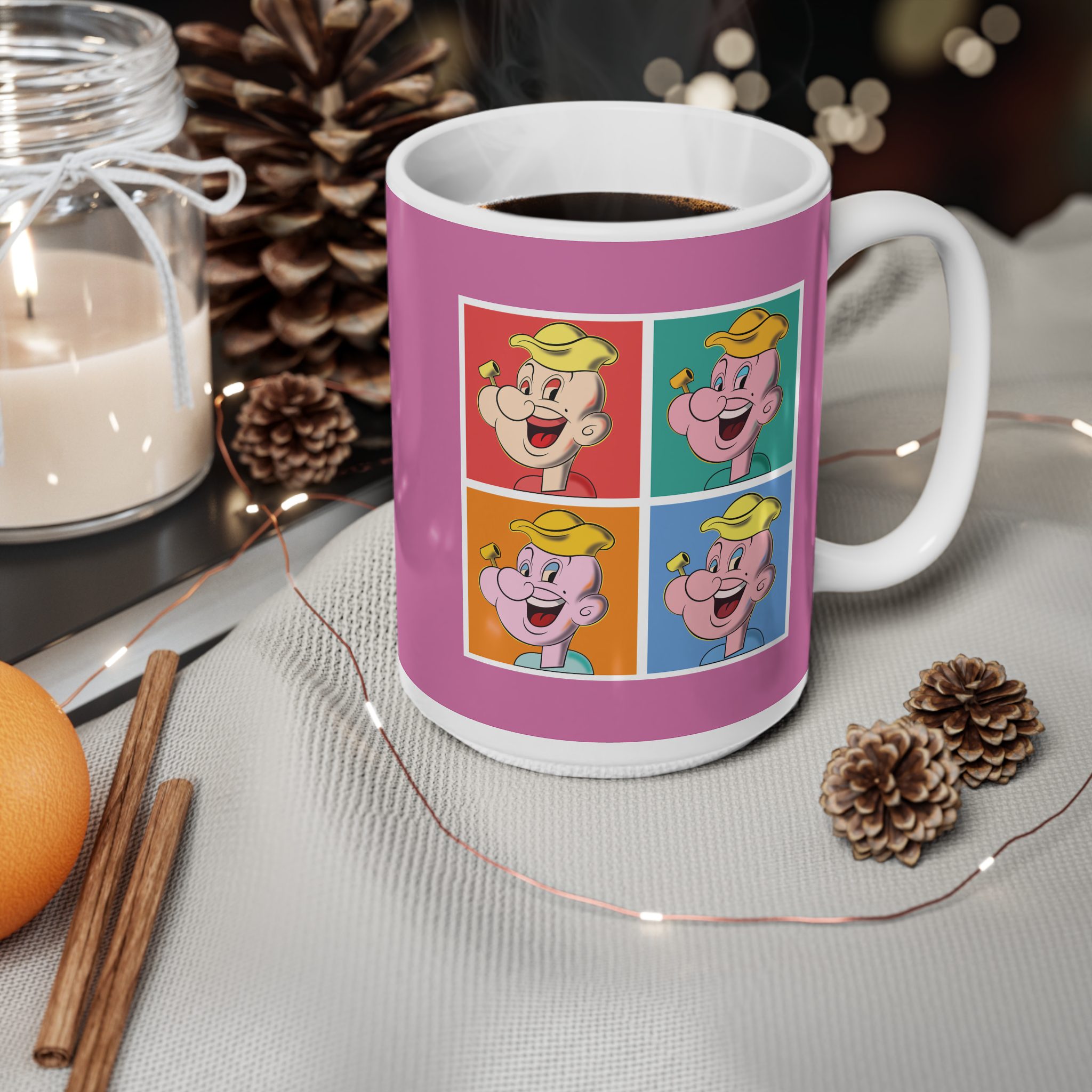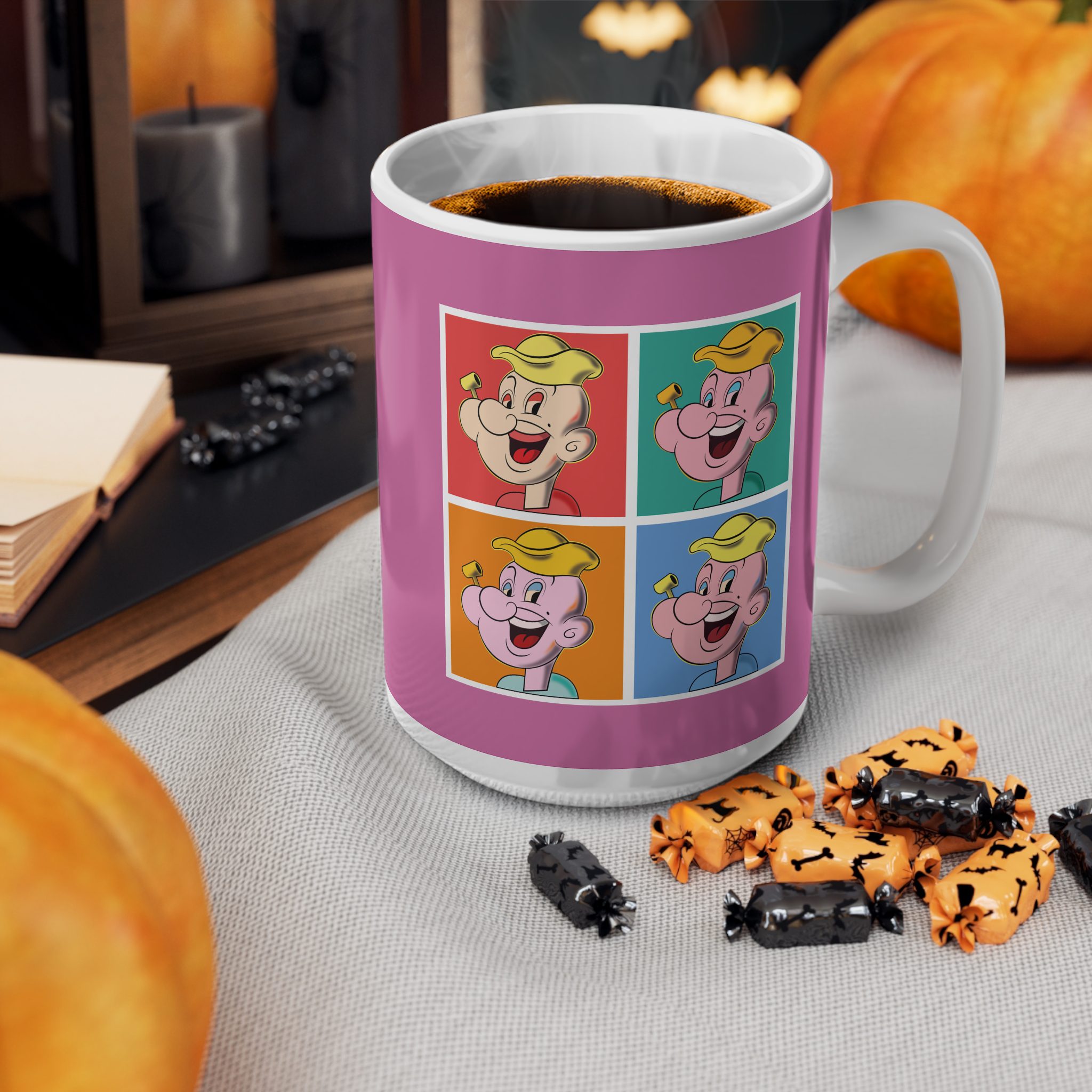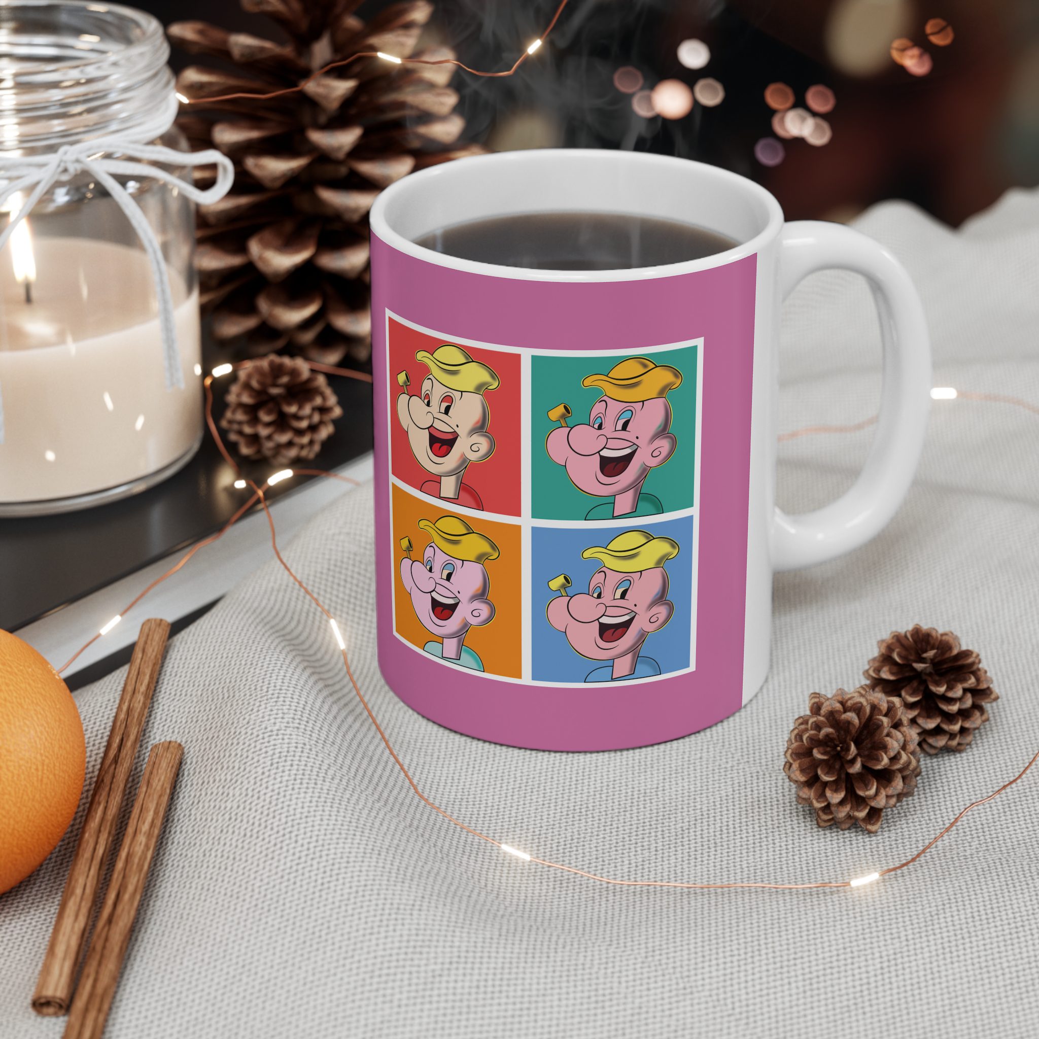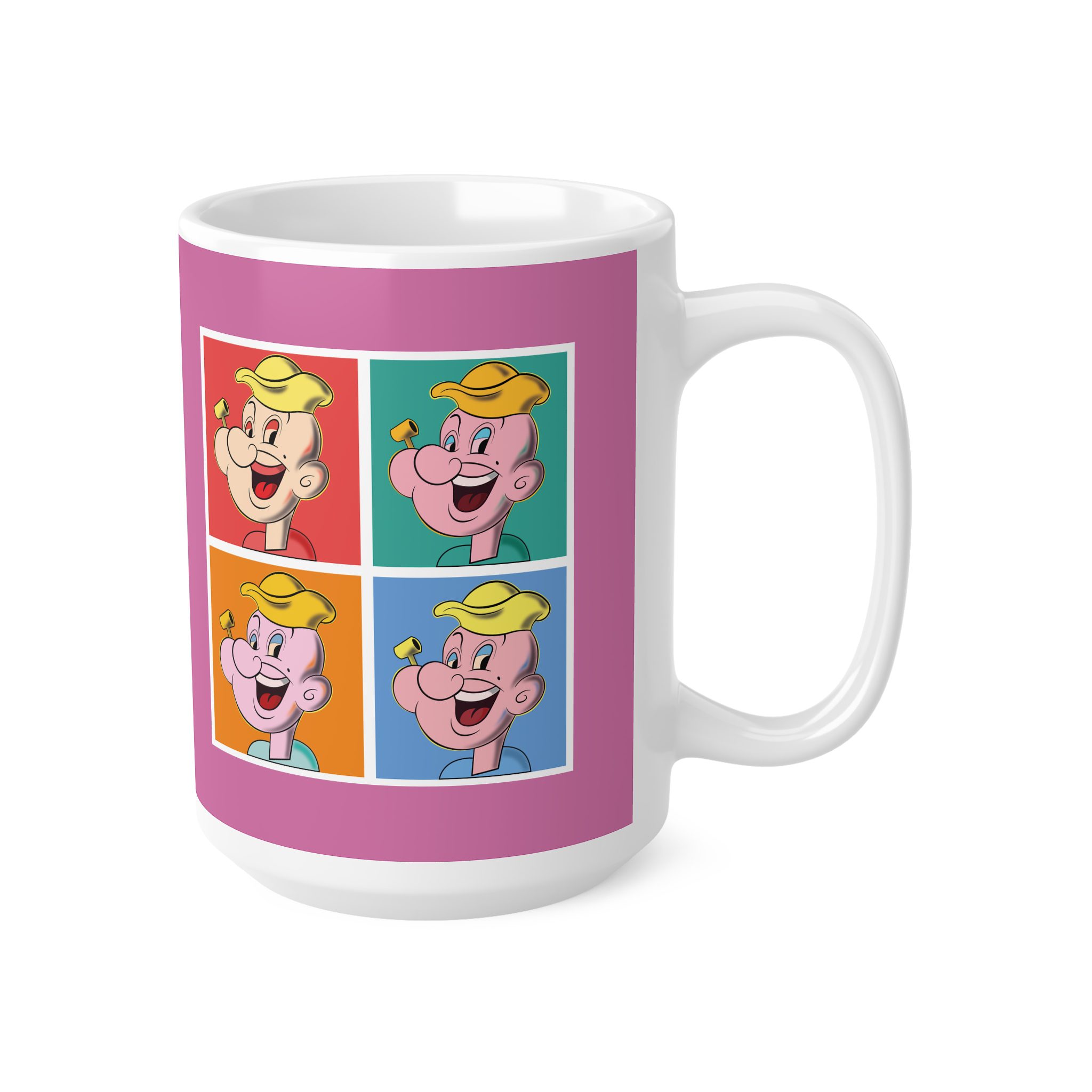This mug transforms a classic strong-sailor archetype into a vivid pop art statement. Through repetition and exaggerated confidence, the design explores how strength, identity, and mass culture collide in modern visual language.