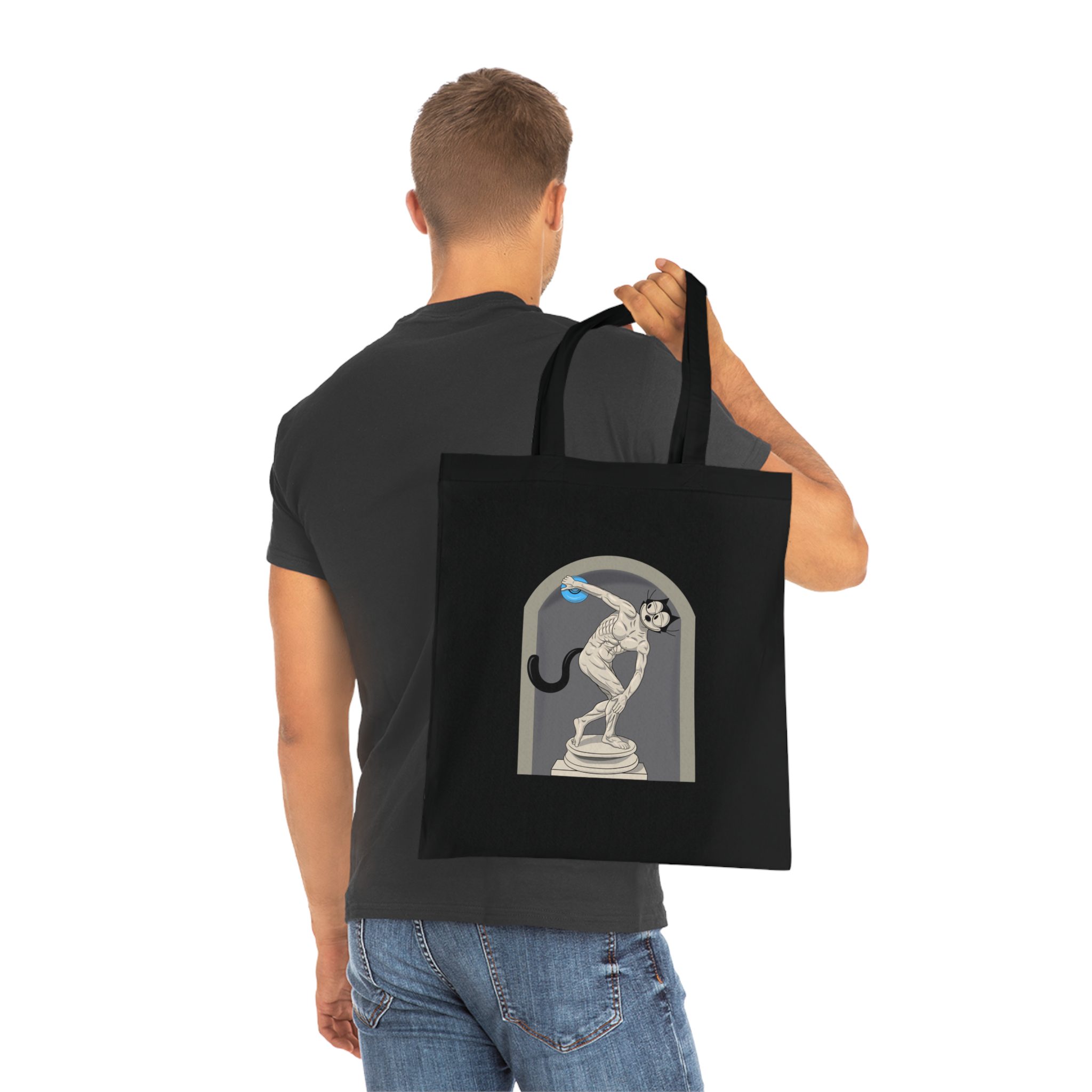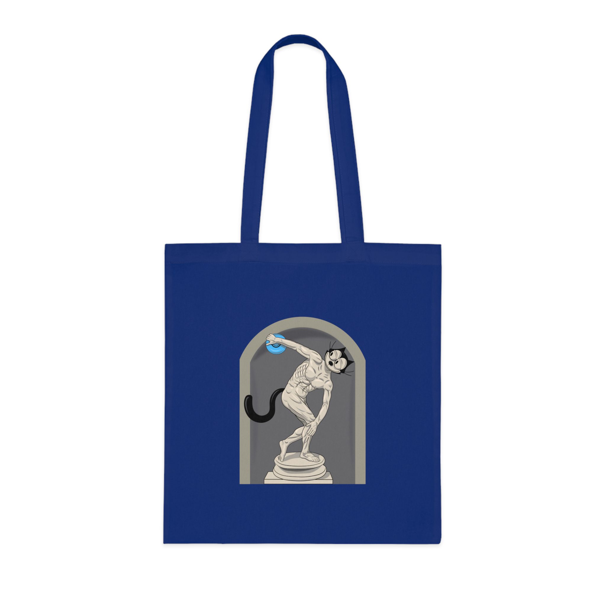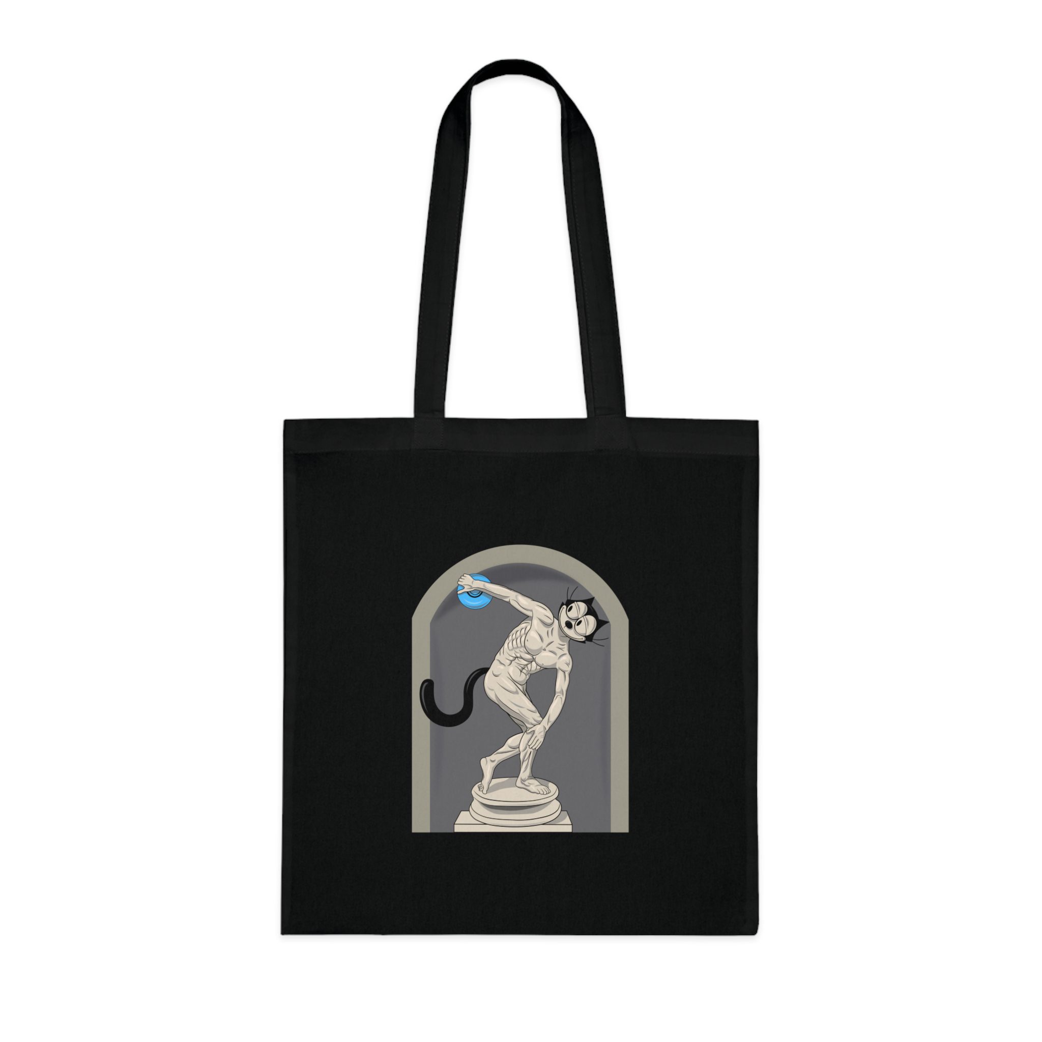 This artwork reimagines the iconic ancient Discobolus pose through a playful illustrated cat character. Classical sculpture aesthetics meet expressive cartoon form, creating a visual contrast between marble-like discipline and animated charm. The result feels both timeless and humorous.