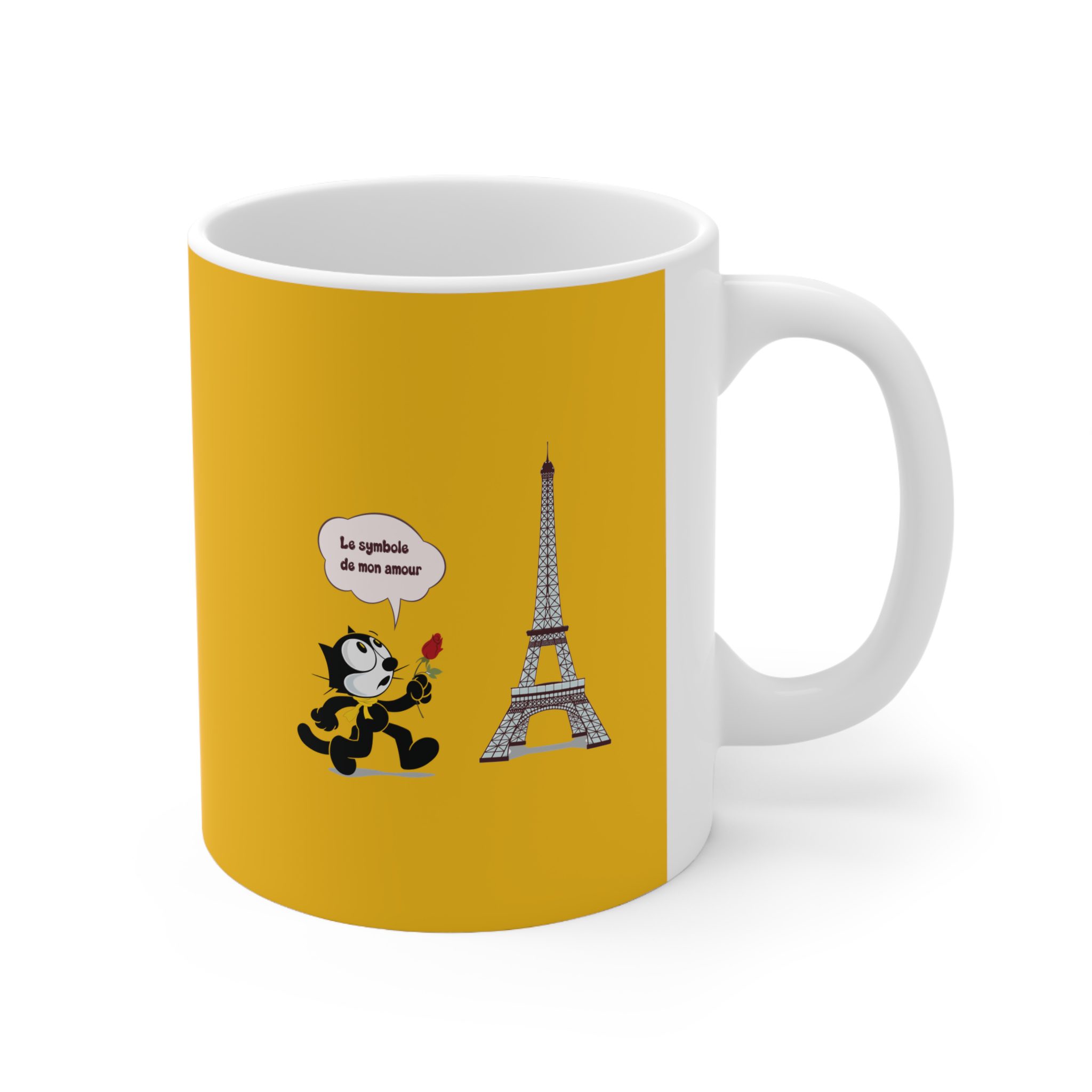 This cup features a Classic Animation Cat captured in a romantic Paris-inspired scene. Holding a rose and standing against a recognizable city backdrop, the illustrated character brings vintage charm, elegance, and a quiet sense of cinematic storytelling.