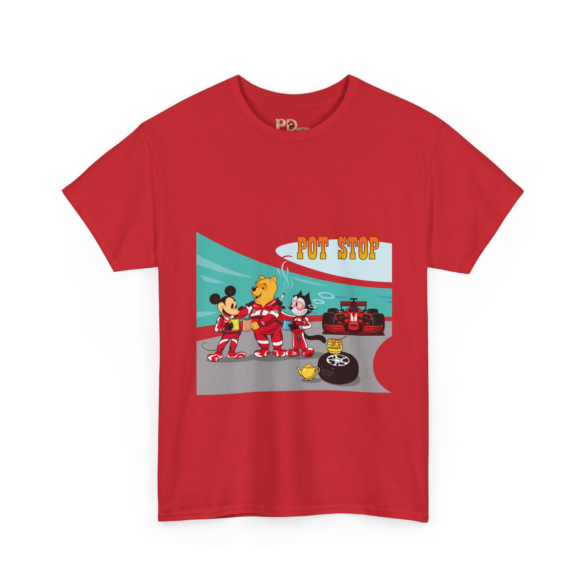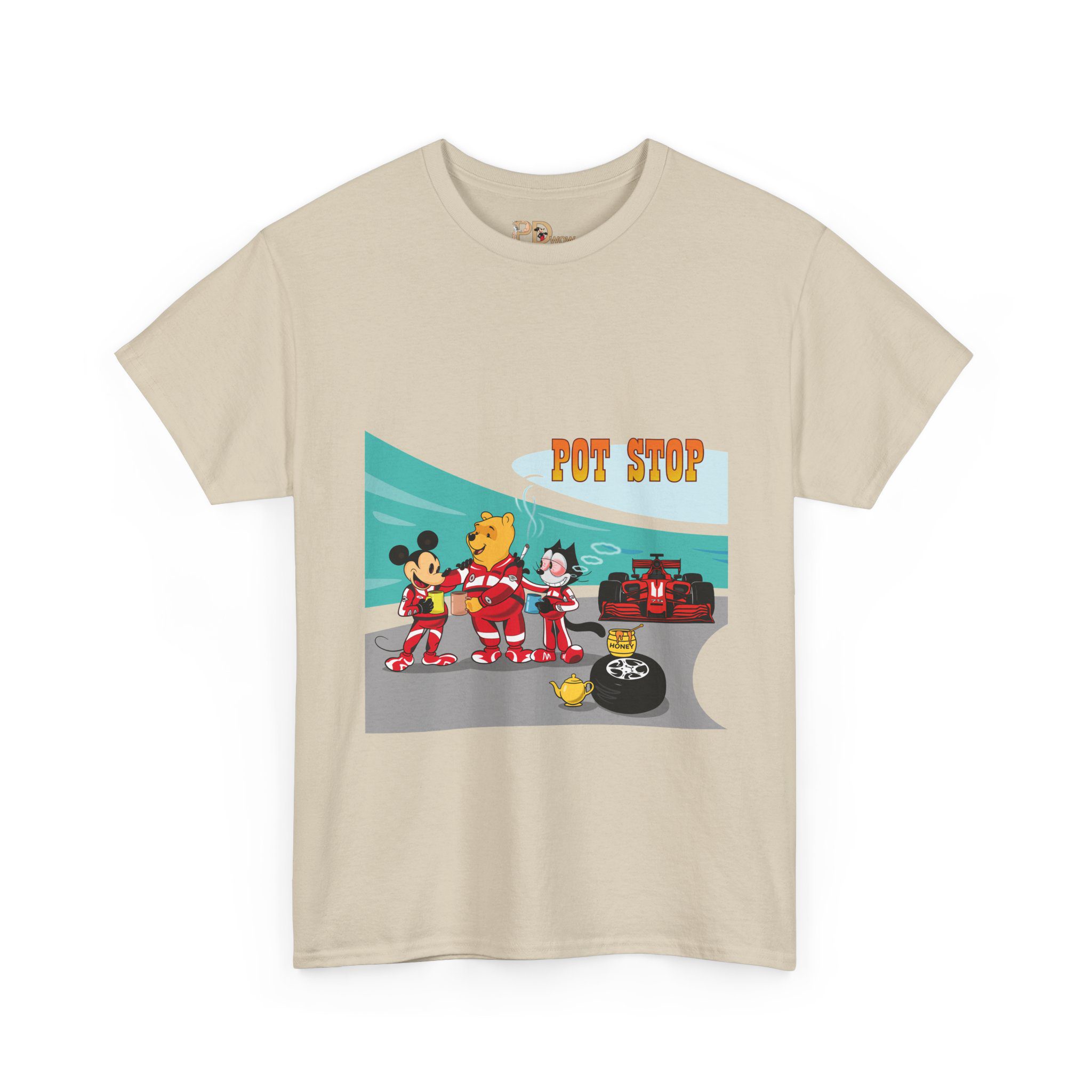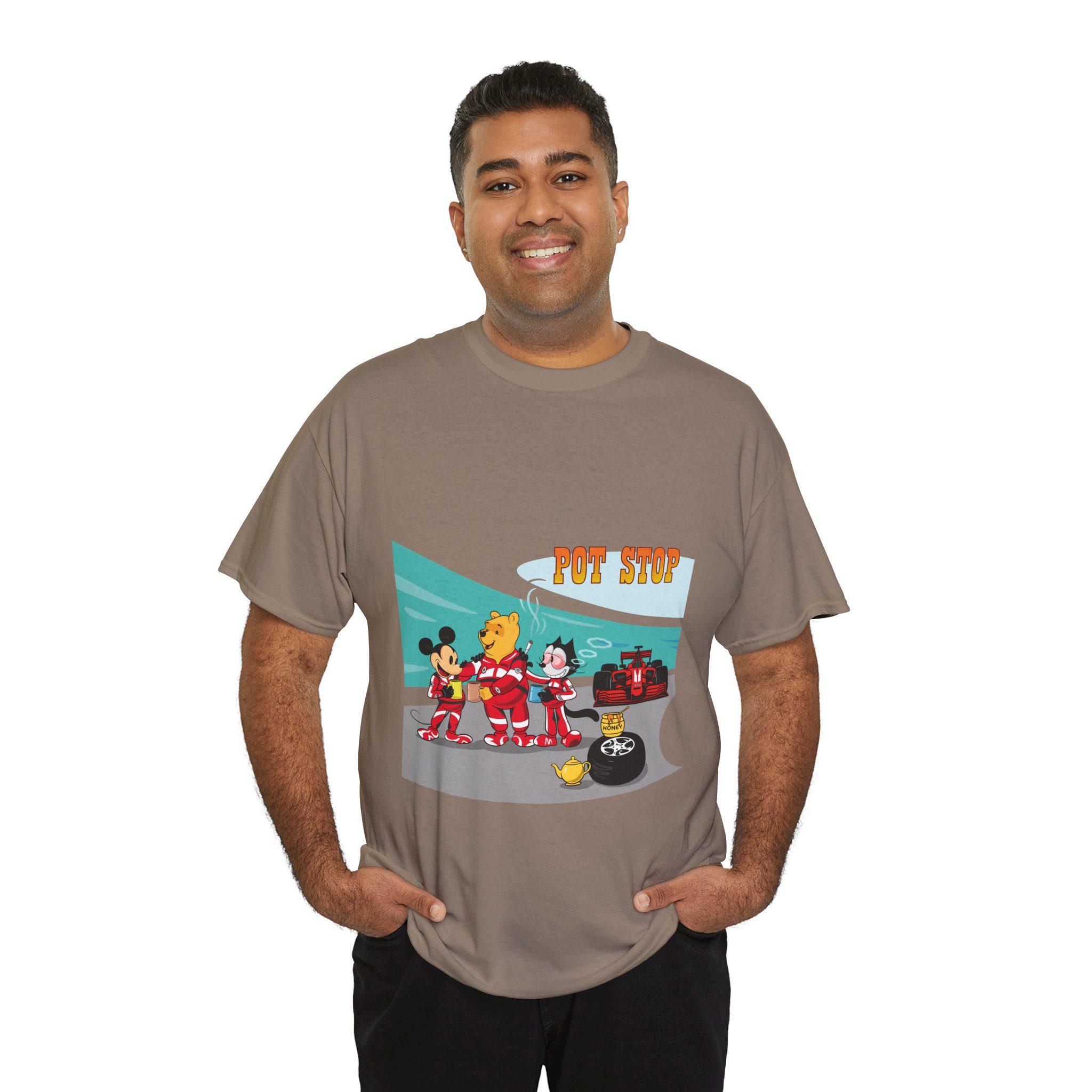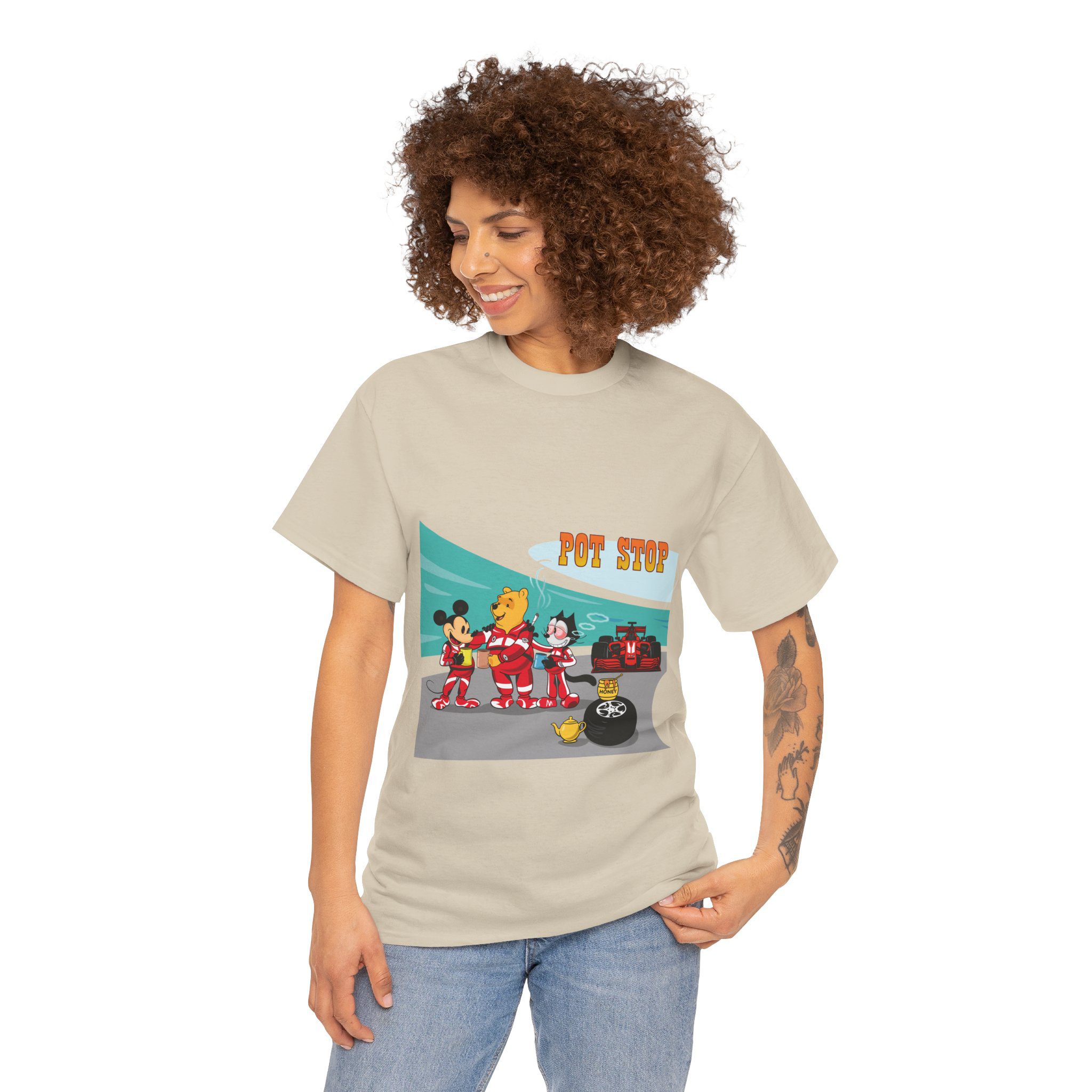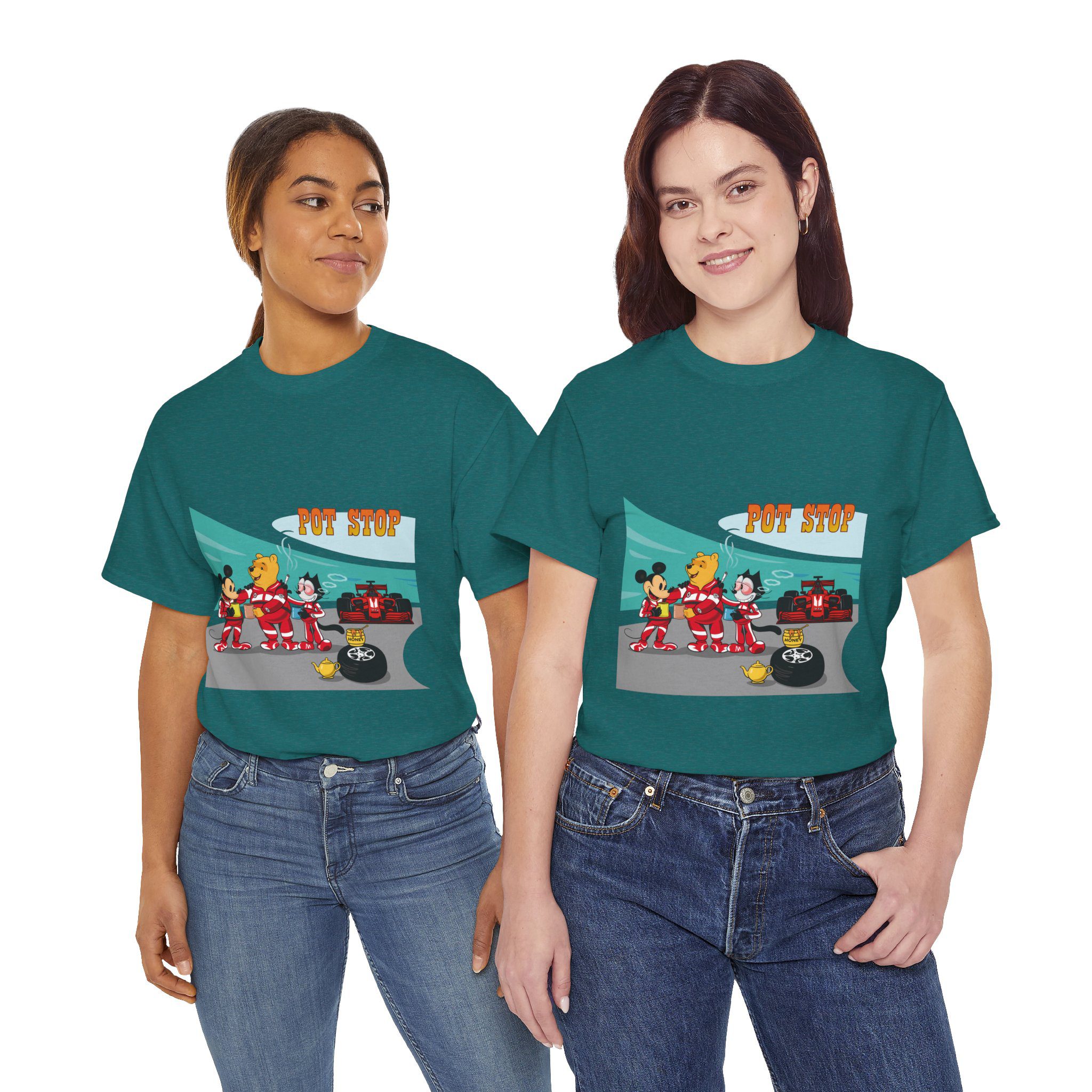 This T-shirt captures a humorous racing pit stop where a Classic Animation Cat, a Vintage Cartoon Mouse, and a Storybook Bear Character pause the action for an unexpected break. Instead of a high-speed routine, the moment turns cozy and playful, blending motorsport energy with everyday comfort.