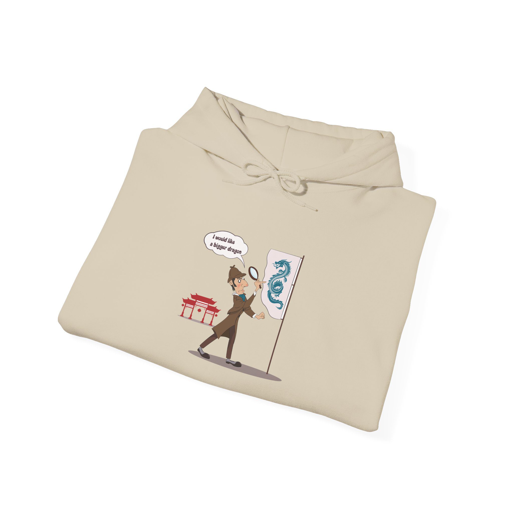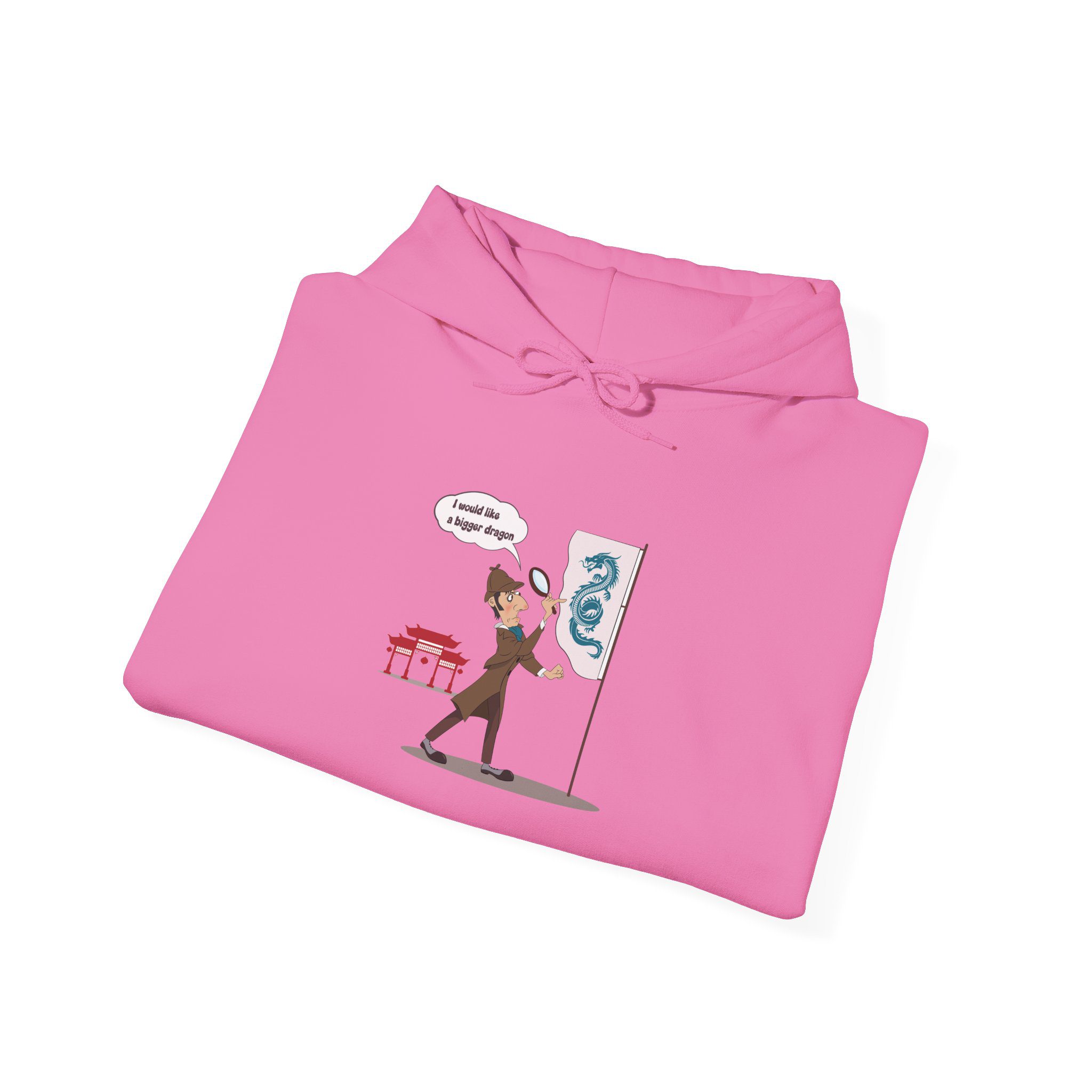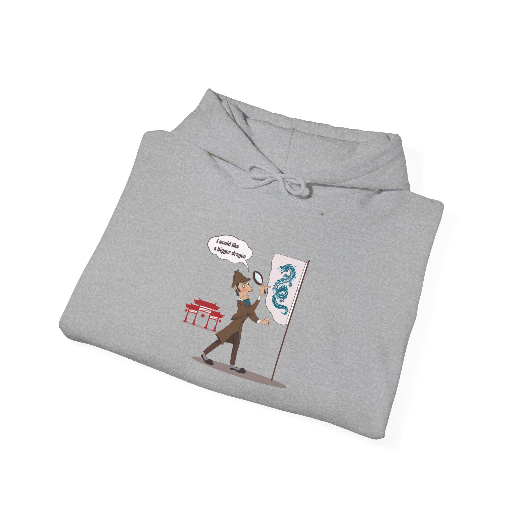 This hoodie features a sharp-minded detective figure facing an unexpectedly tiny dragon. The scene plays on contrast and understatement, turning a legendary creature into a quietly humorous moment of mild disappointment and analytical calm.