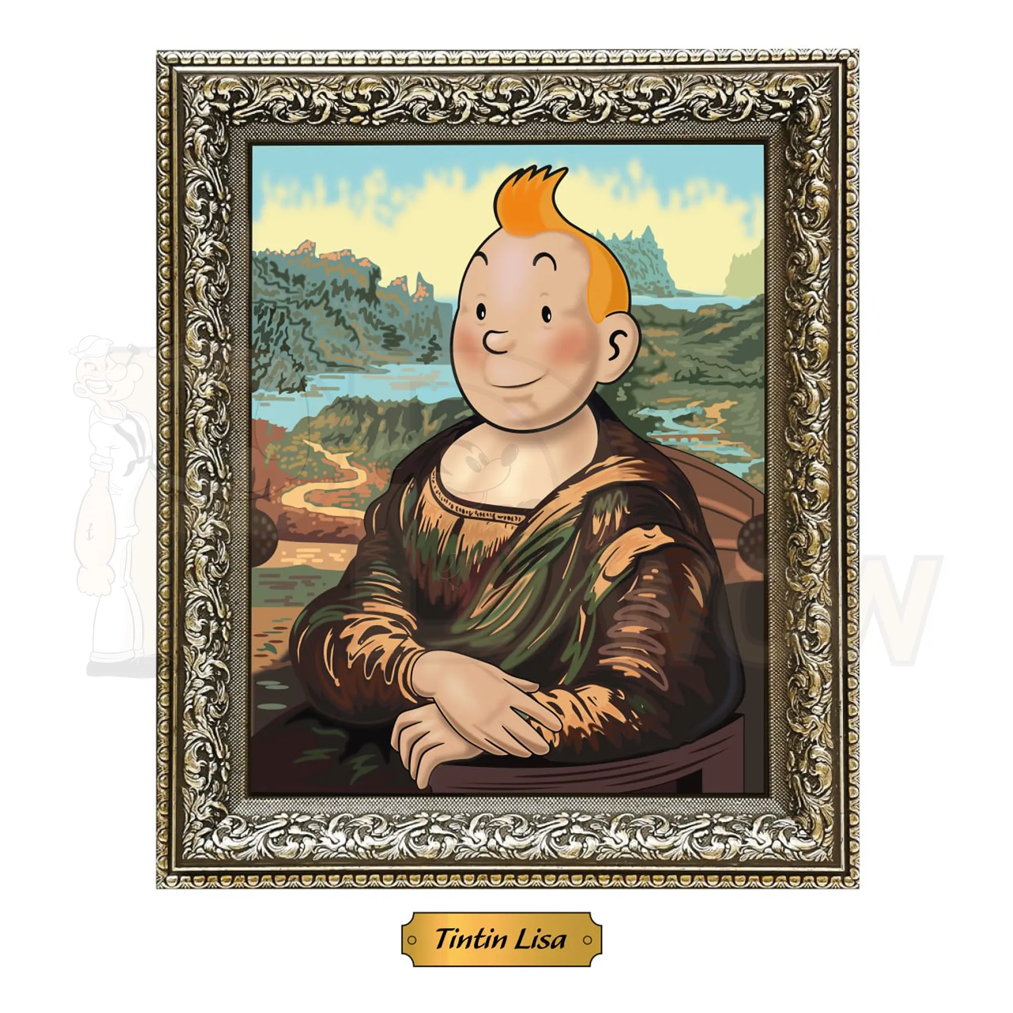 This artwork mashup transforms a classic Renaissance portrait into a bright and curious scene. The illustrated character’s distinctive hairstyle, wide eyes, and gentle smile replace the original expression. Because of this change, the composition feels light and adventurous. The calm landscape remains faithful to the traditional style, while the cartoon character’s charm introduces a subtle modern twist.