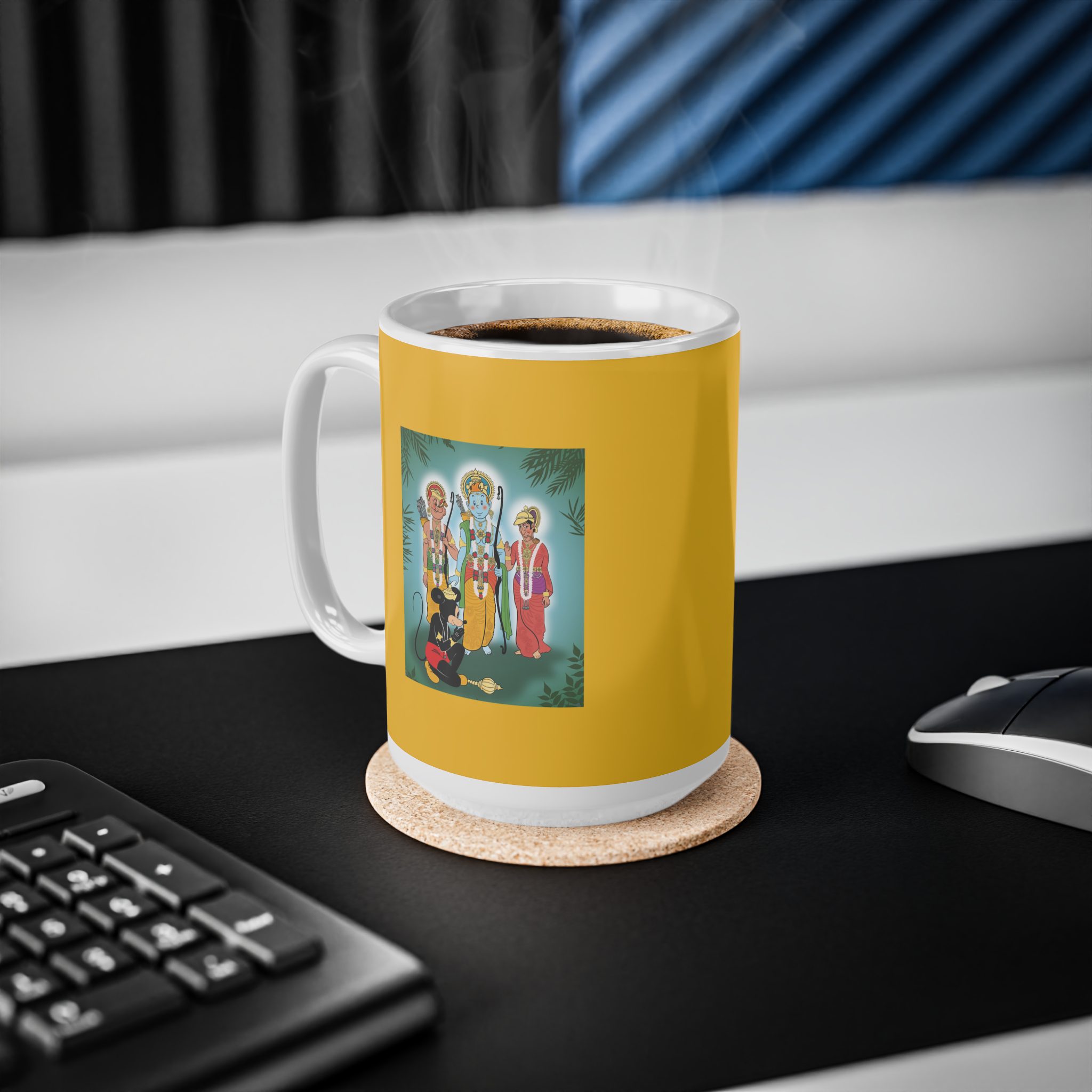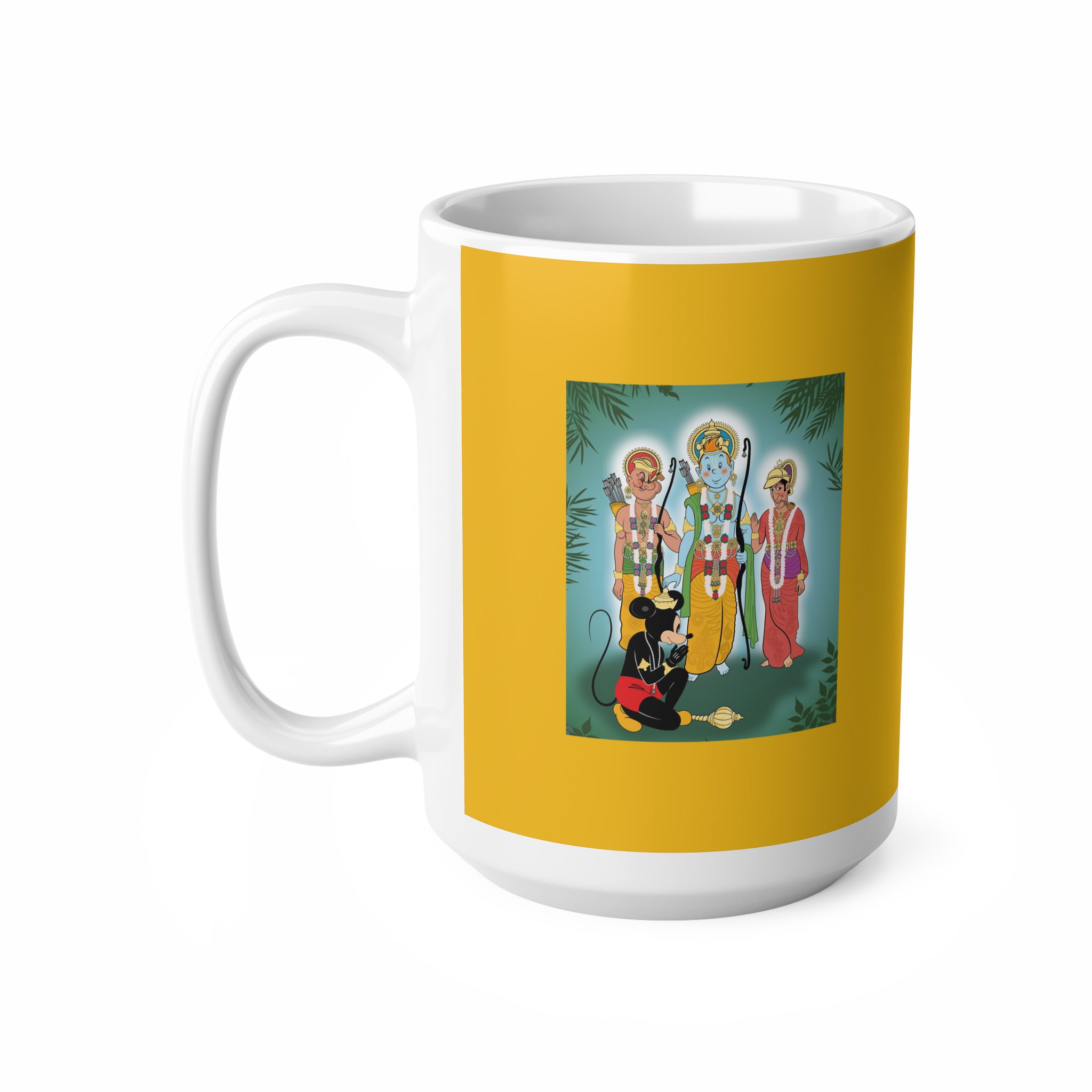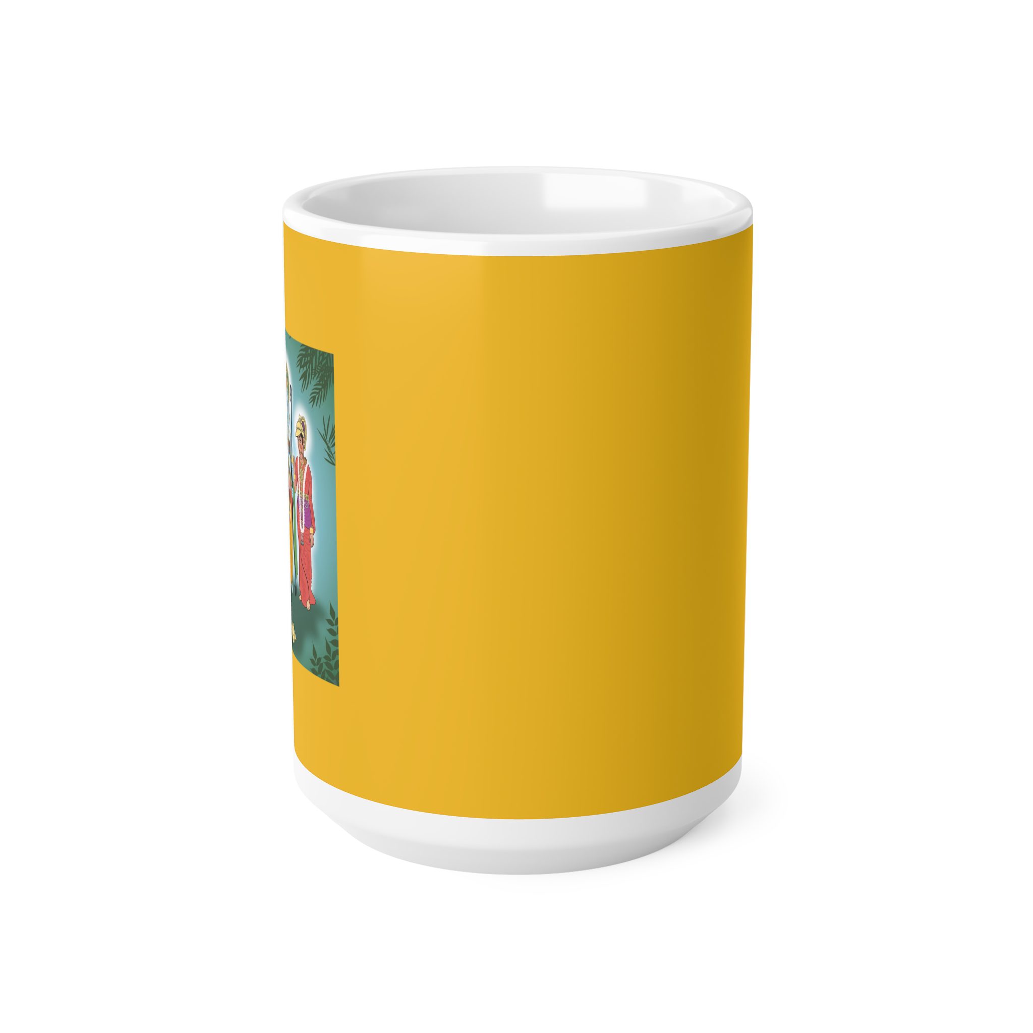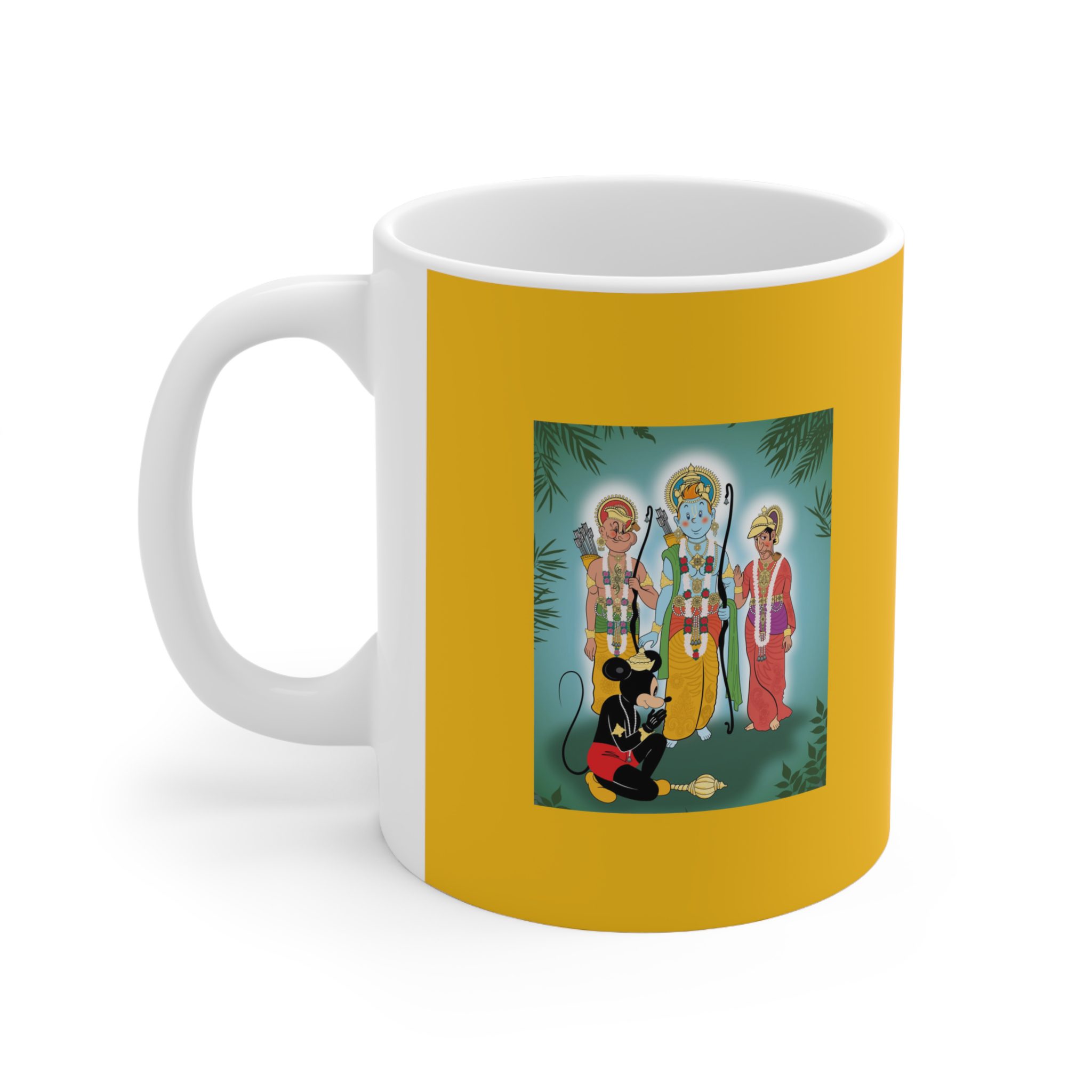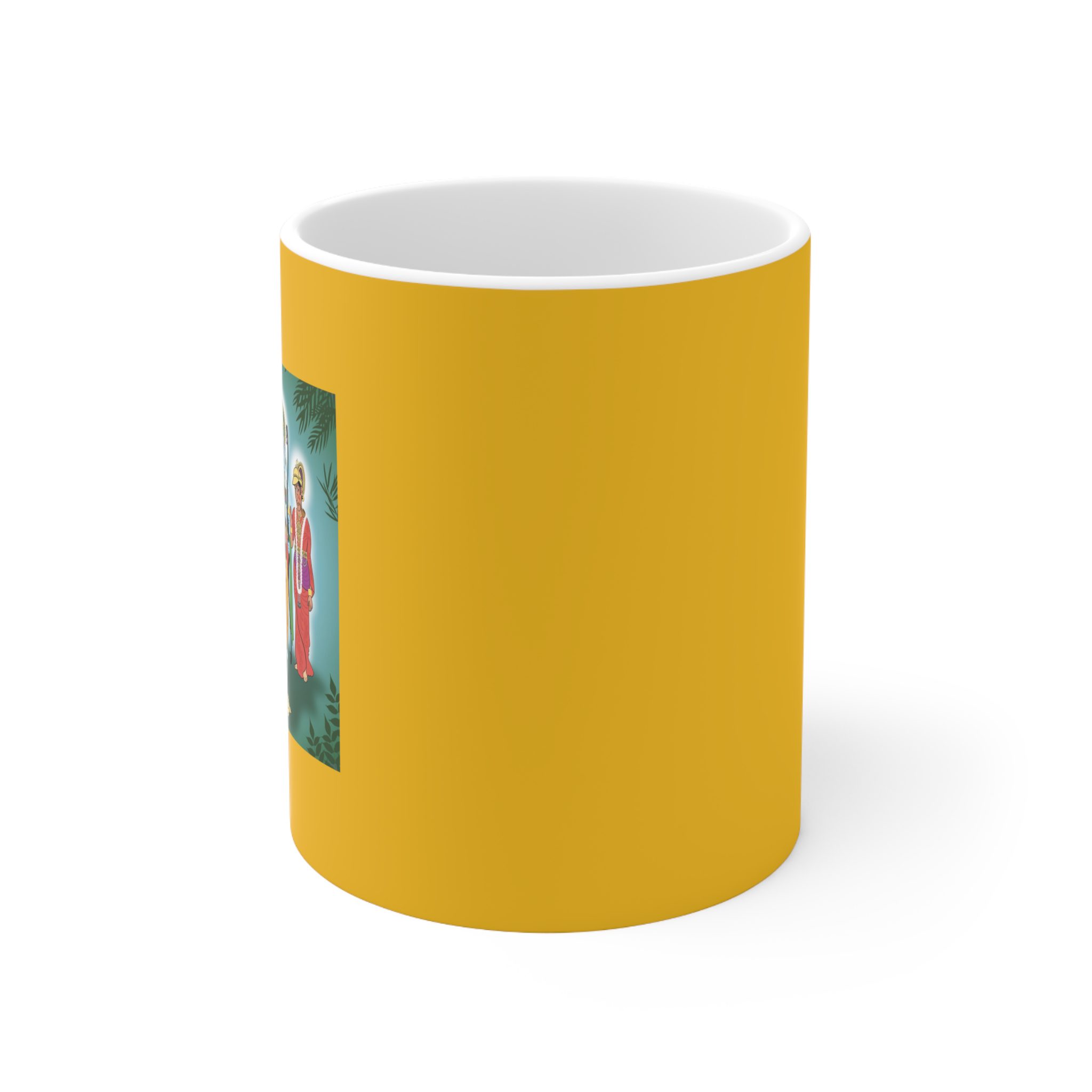 This cup presents a vibrant travel scene set in India, featuring a European Comic Explorer surrounded by illustrated companions. The artwork captures a sense of discovery, cultural richness, and shared adventure through a warm and playful visual narrative.