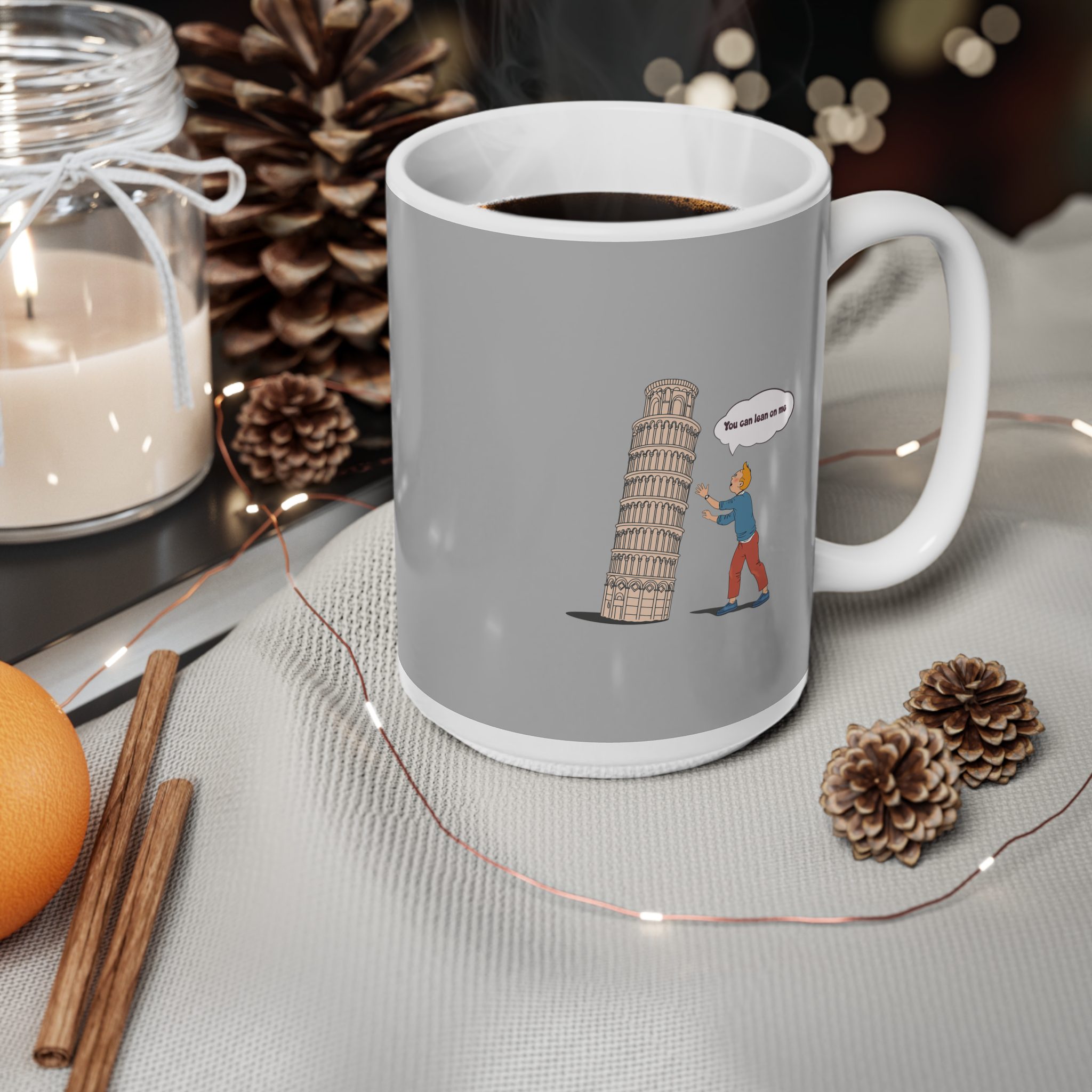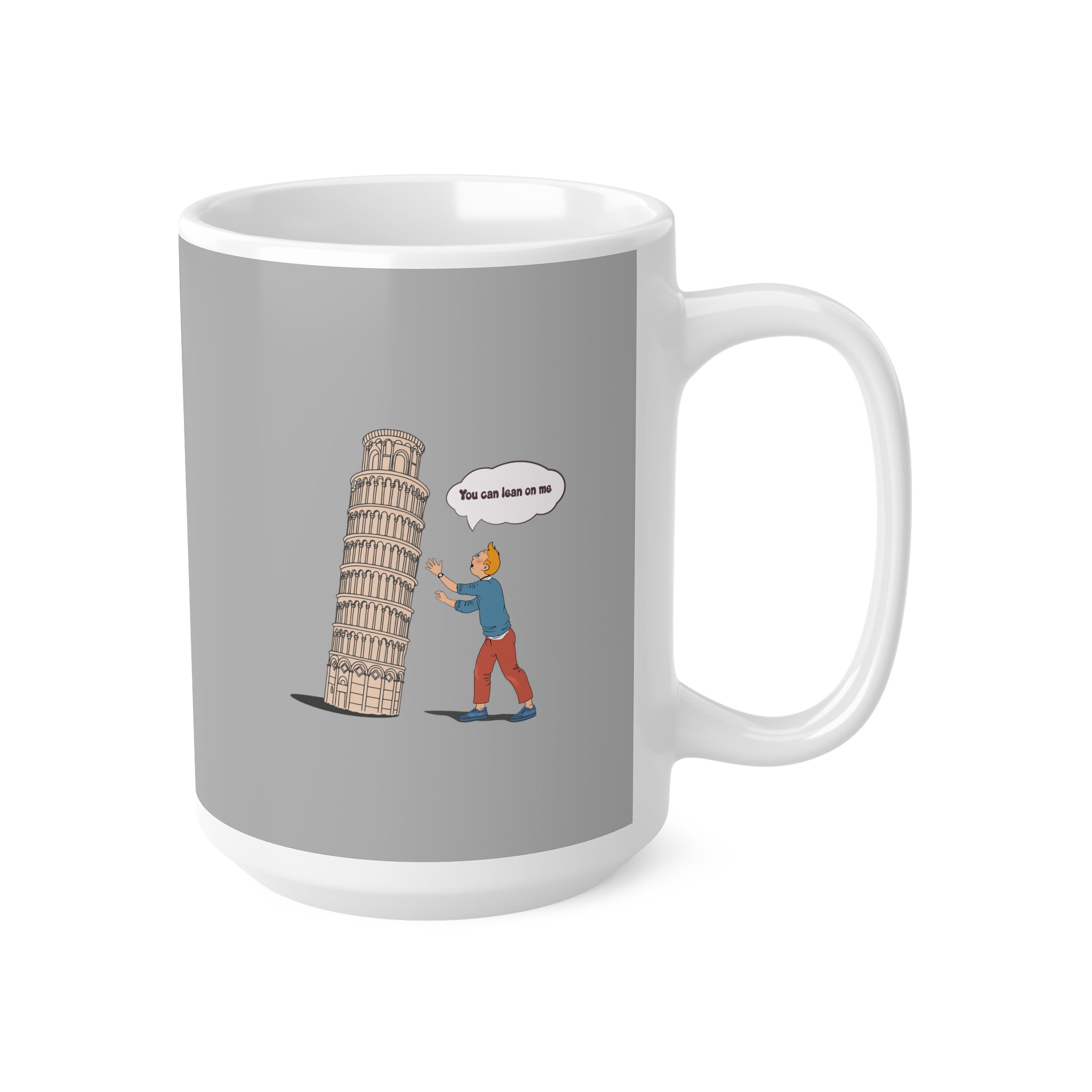 This cup features a European Comic Explorer captured in a playful travel moment beside a famous leaning landmark. The illustration turns a well-known architectural scene into a lighthearted visual story about balance, curiosity, and exploration.