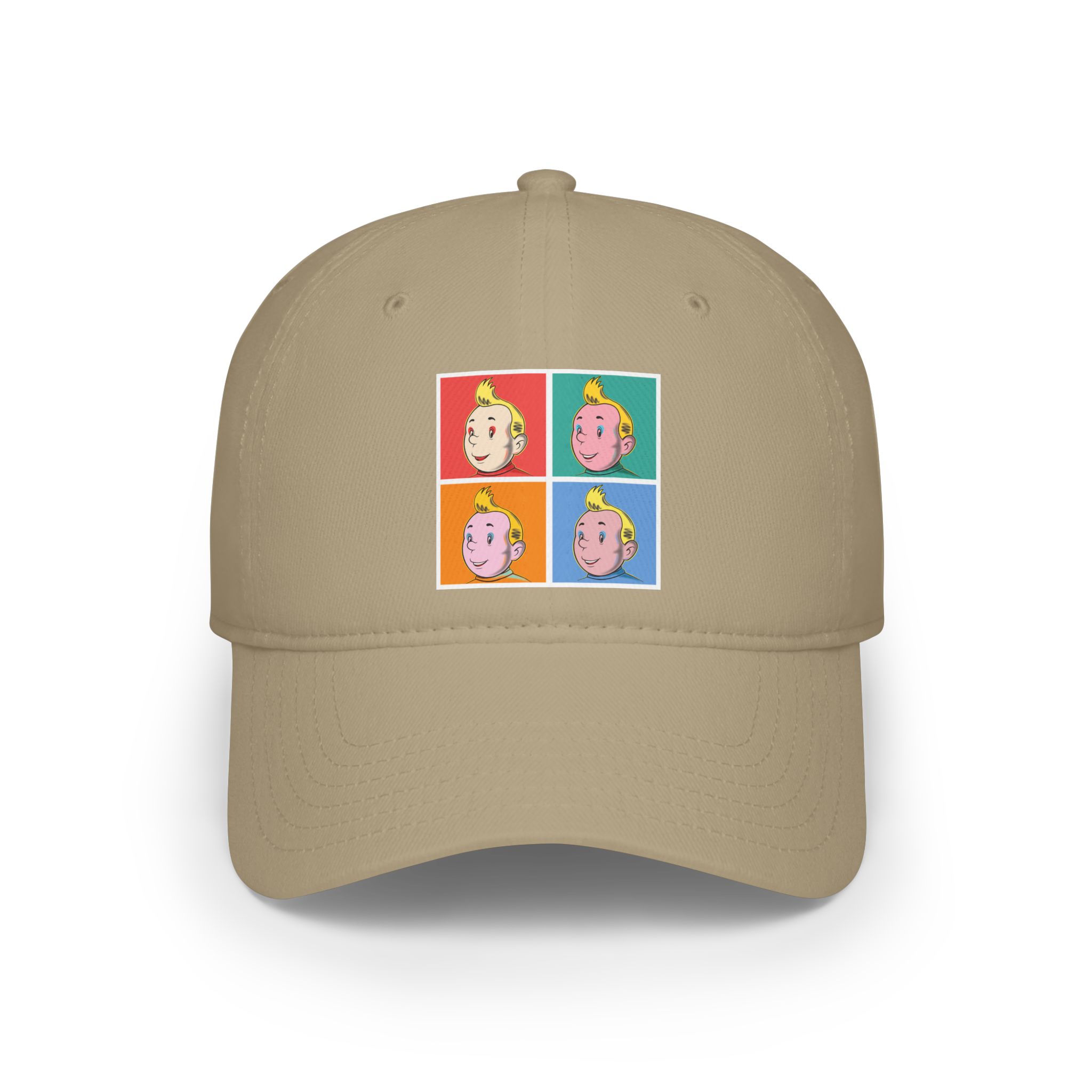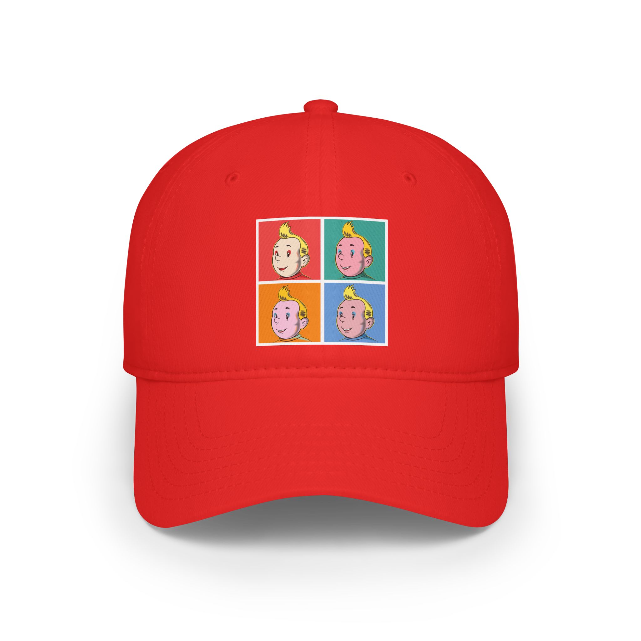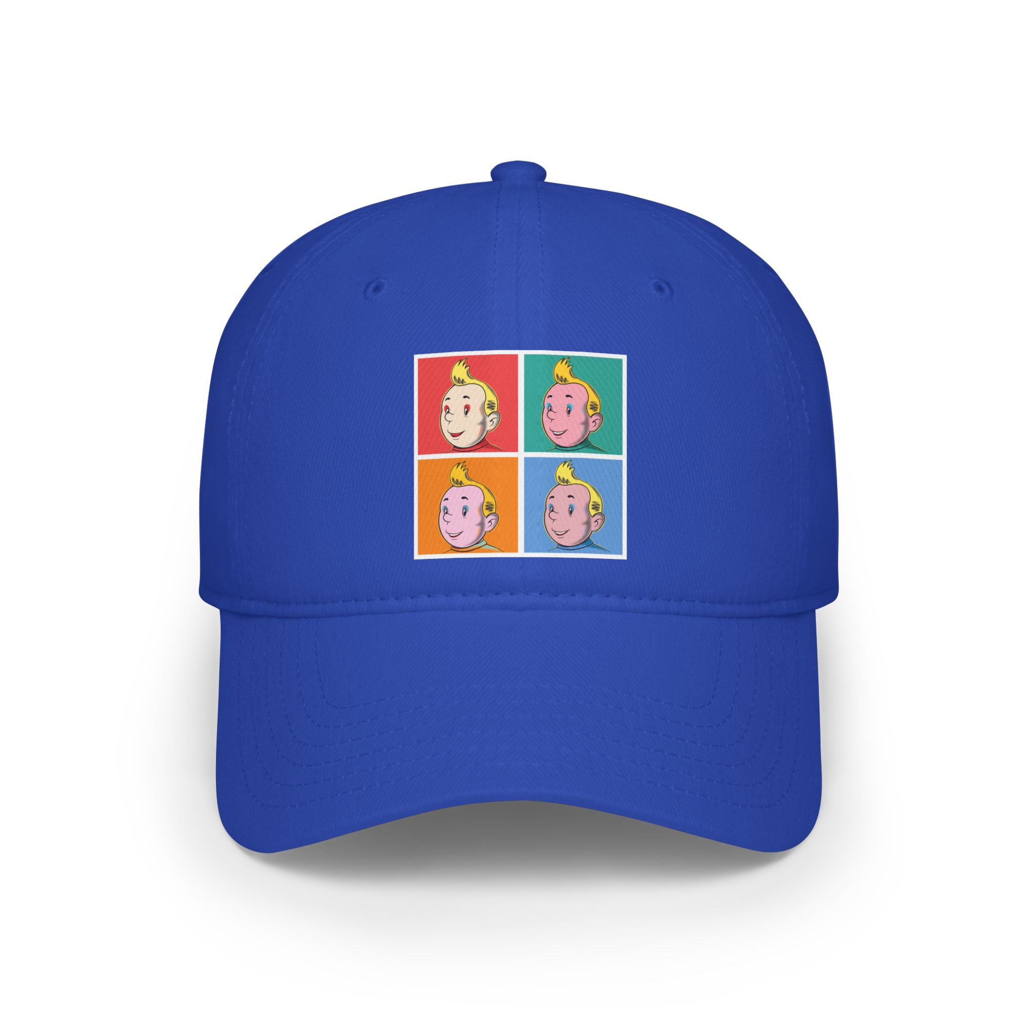 This cap delivers a sharp pop-art reinterpretation where a European Comic Explorer is transformed into a bold graphic icon. Clean lines, vivid color blocks, and repeated expressions turn the character into a self-aware visual statement inspired by classic commercial art aesthetics.