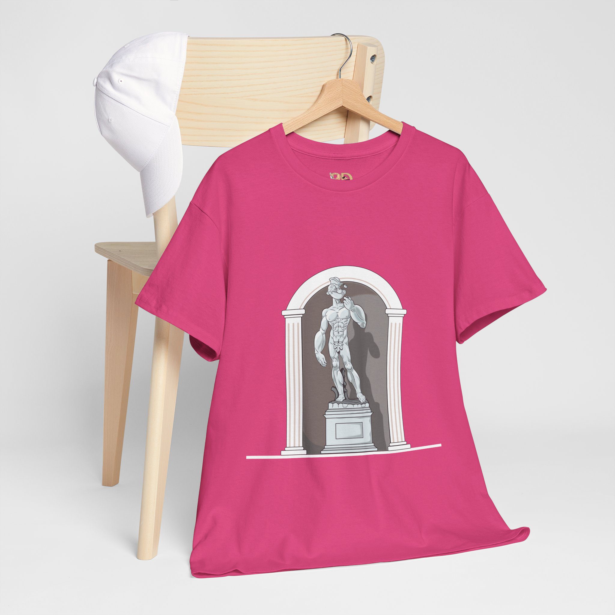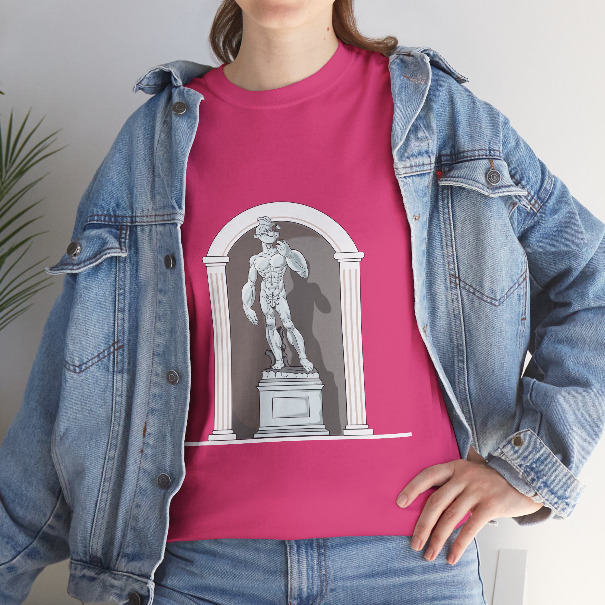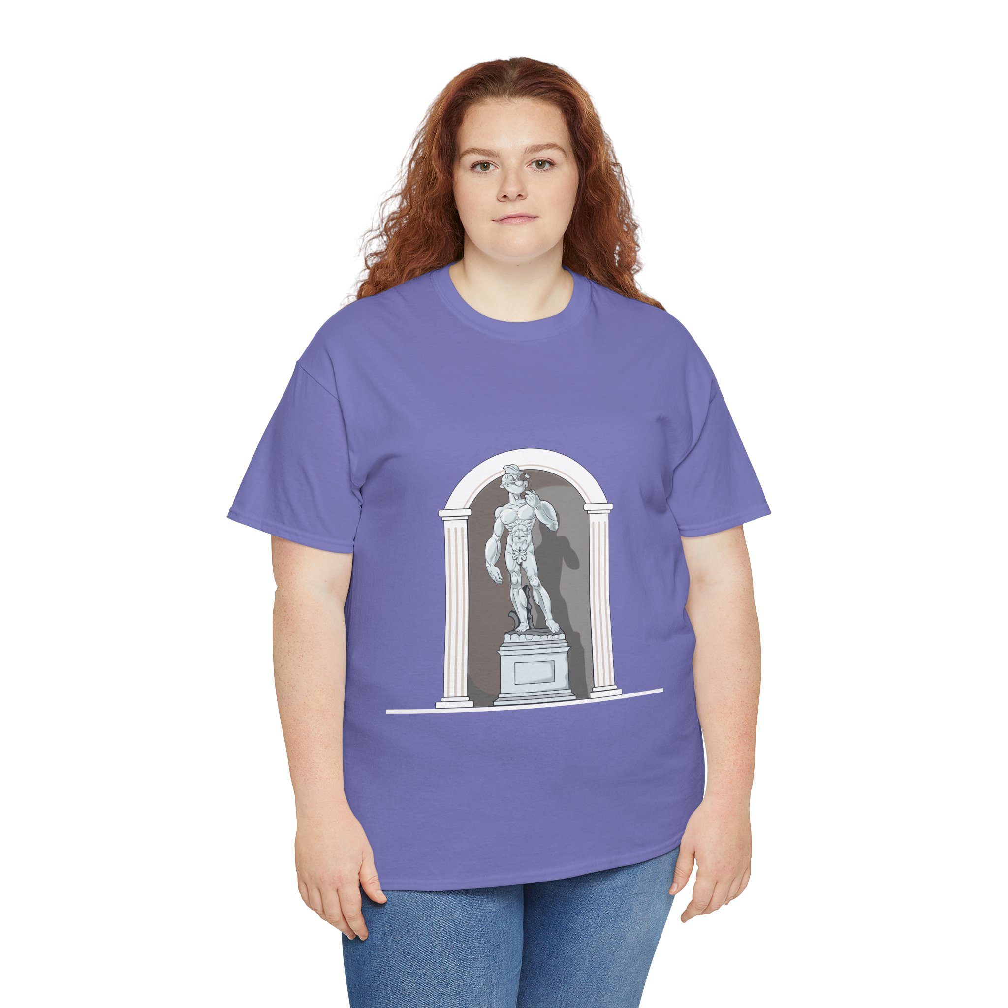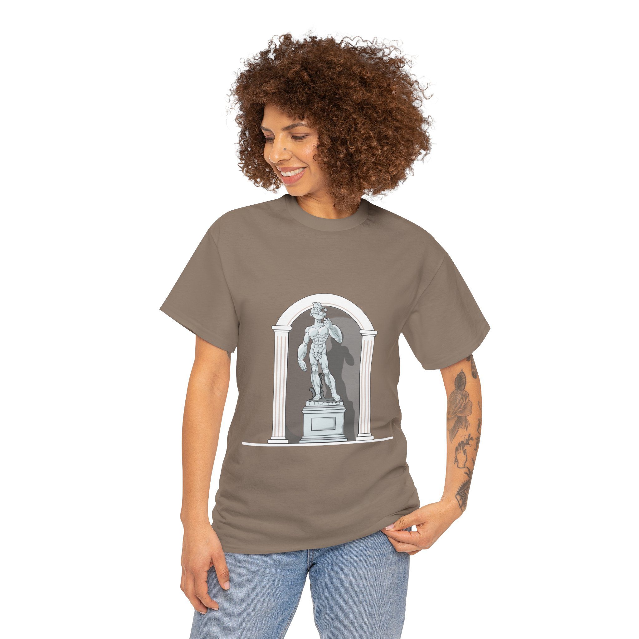 This design reimagines a classical stone figure through a bold, contemporary lens. A confident illustrated character stands in a timeless sculptural pose, blending strength, attitude, and playful irony into a fresh visual statement.
