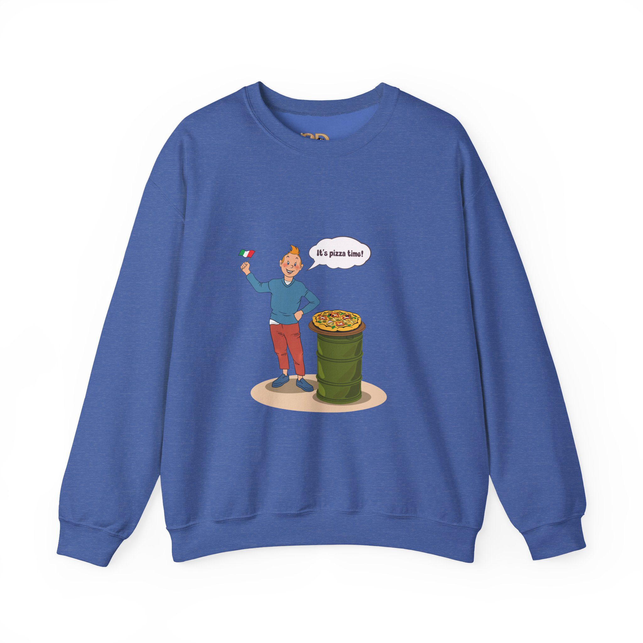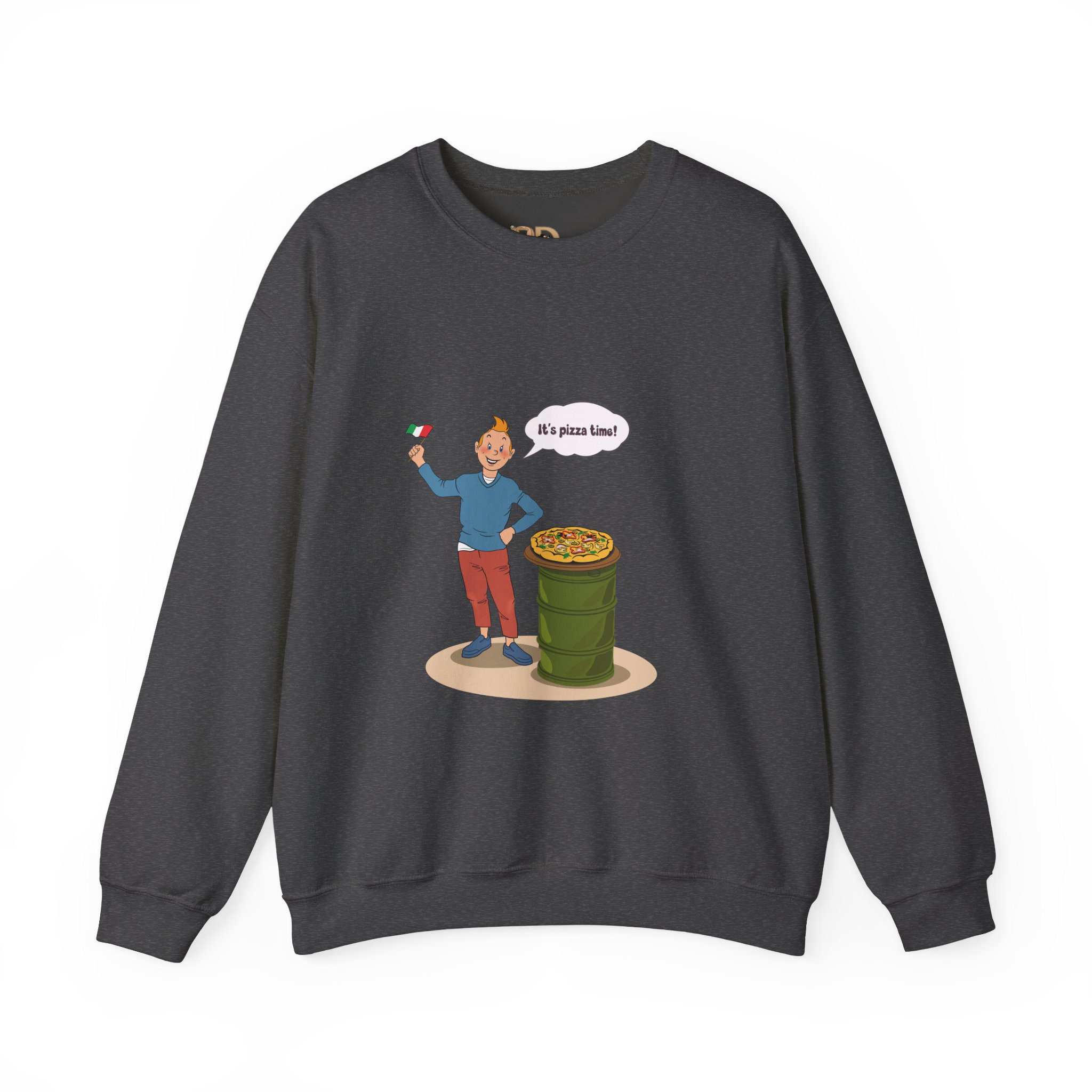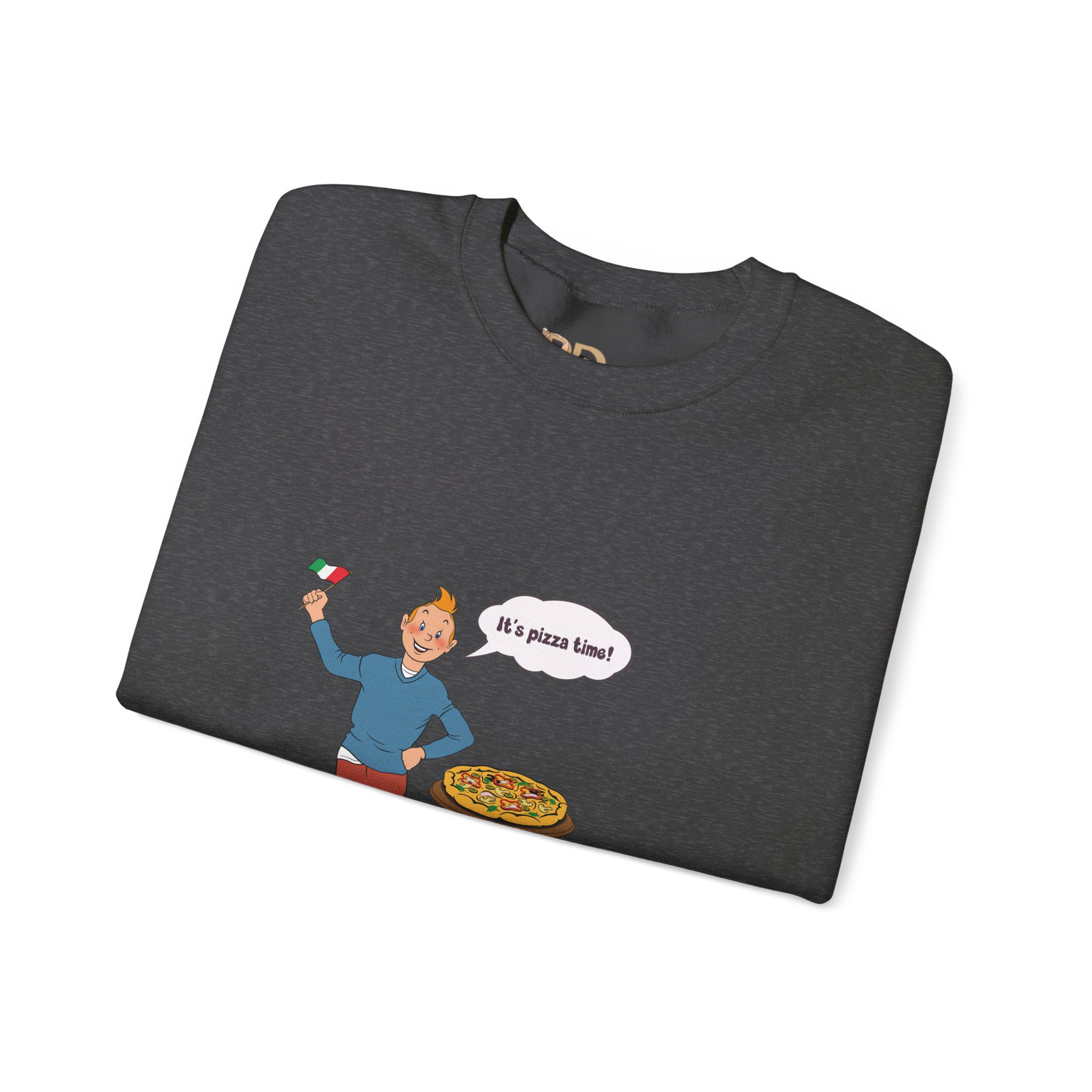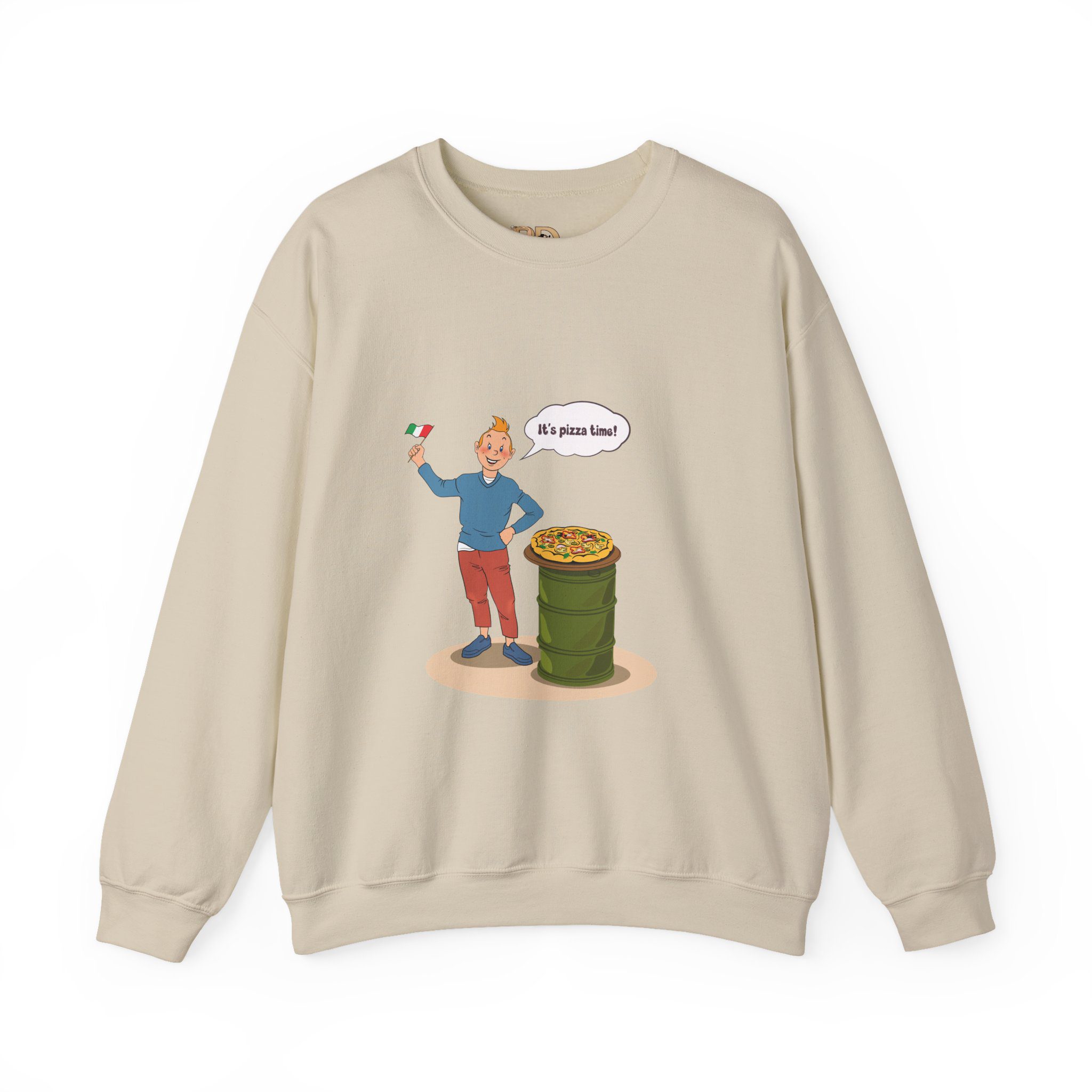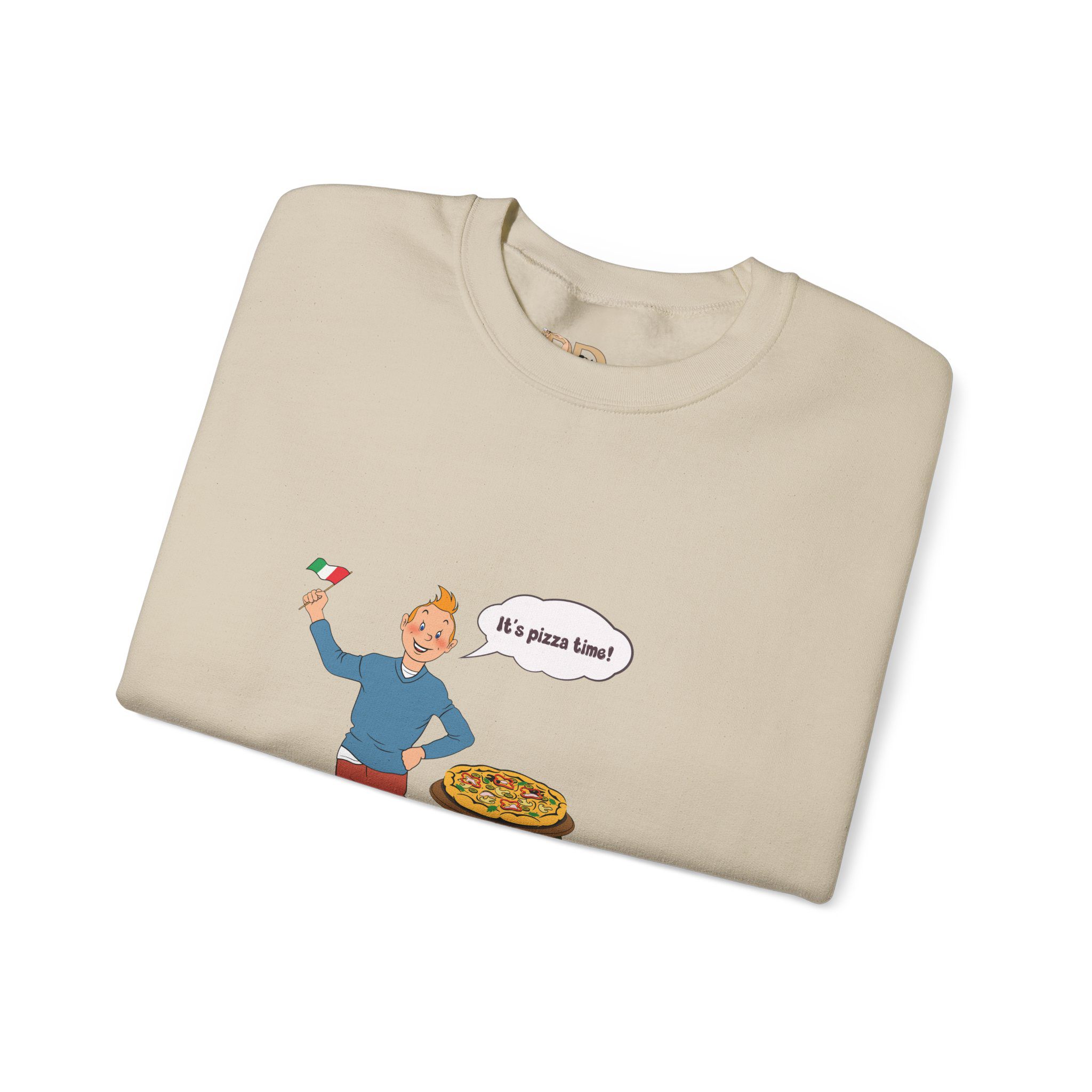 This design captures a joyful illustrated character celebrating comfort food in a lighthearted, everyday moment. A waving flag, a fresh pizza, and an open, enthusiastic gesture turn a simple scene into a visual story about warmth, appetite, and simple pleasures.