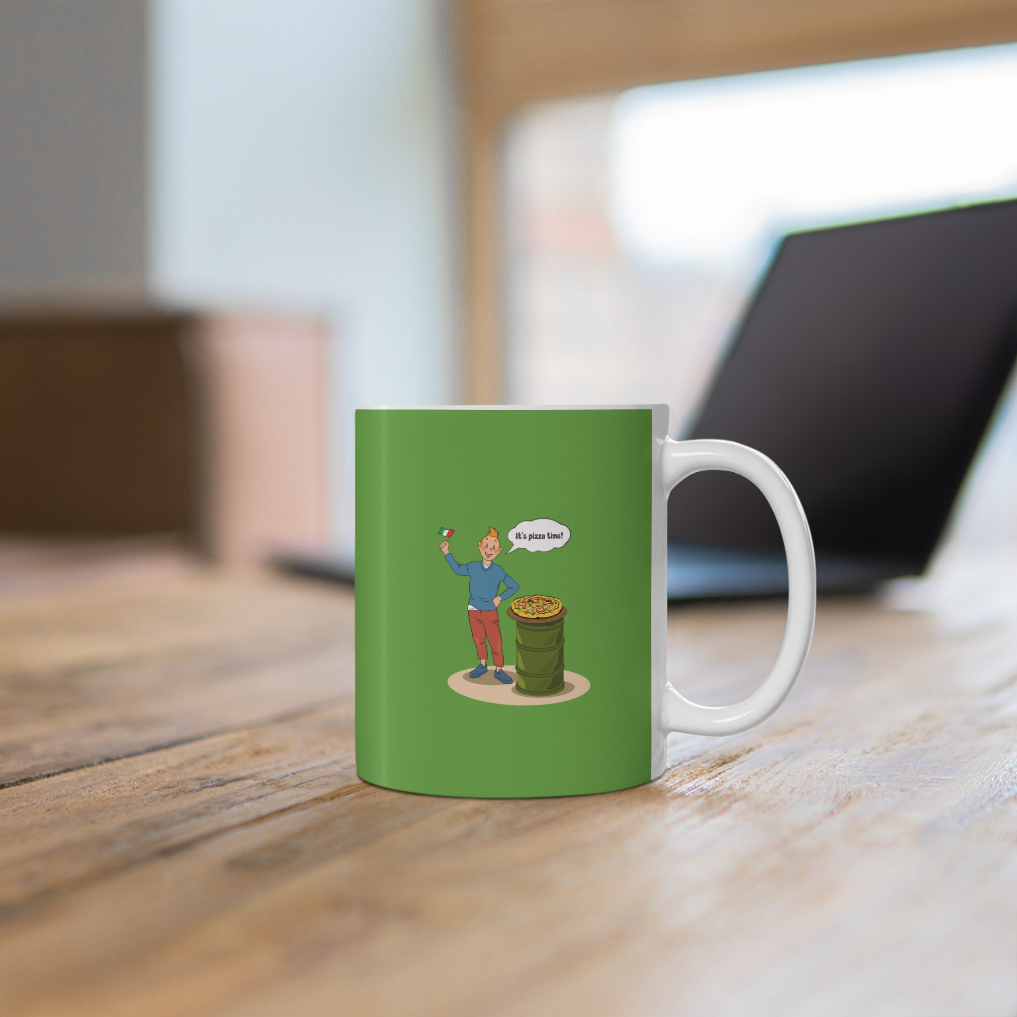 This cup features a cheerful illustrated moment centered around pure comfort and joy. A friendly figure enjoys a generous slice of pizza, turning a simple food scene into a warm, humorous visual about everyday happiness and small pleasures.