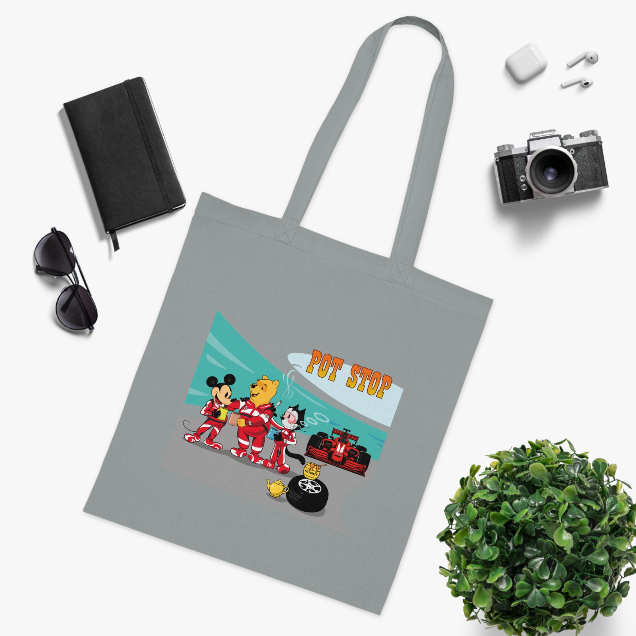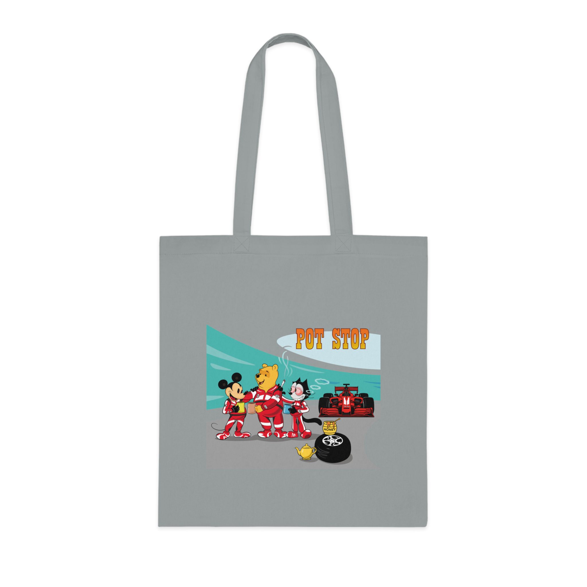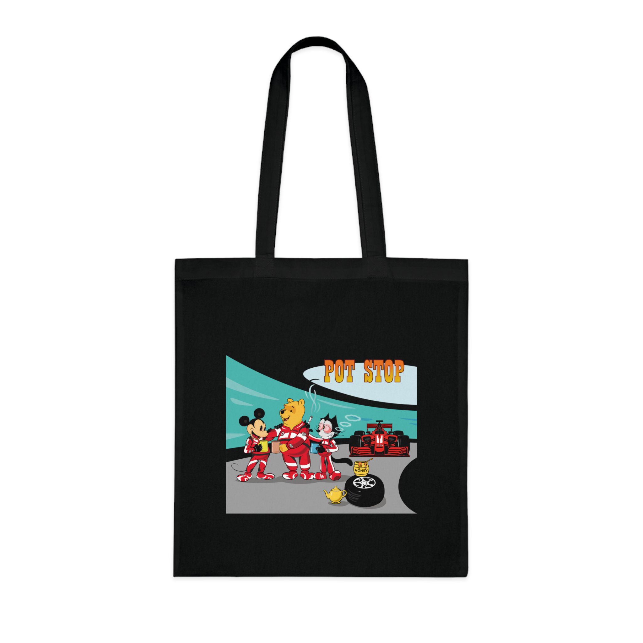 Playful Racing Pit Stop Art Tote Bag with Cozy Tea Break Scene
