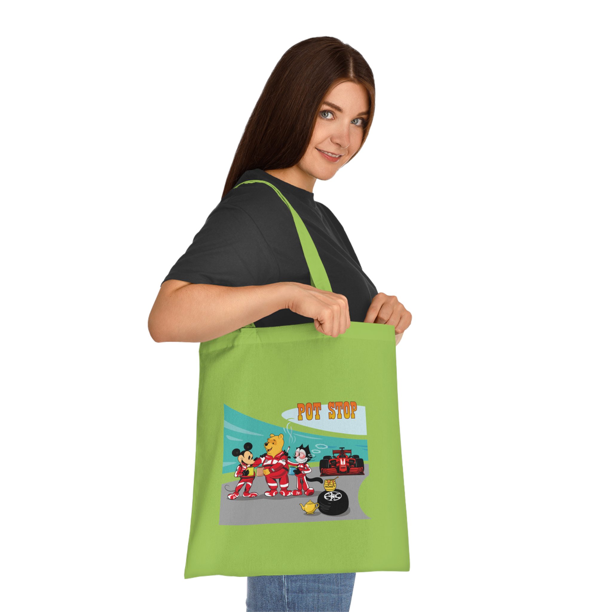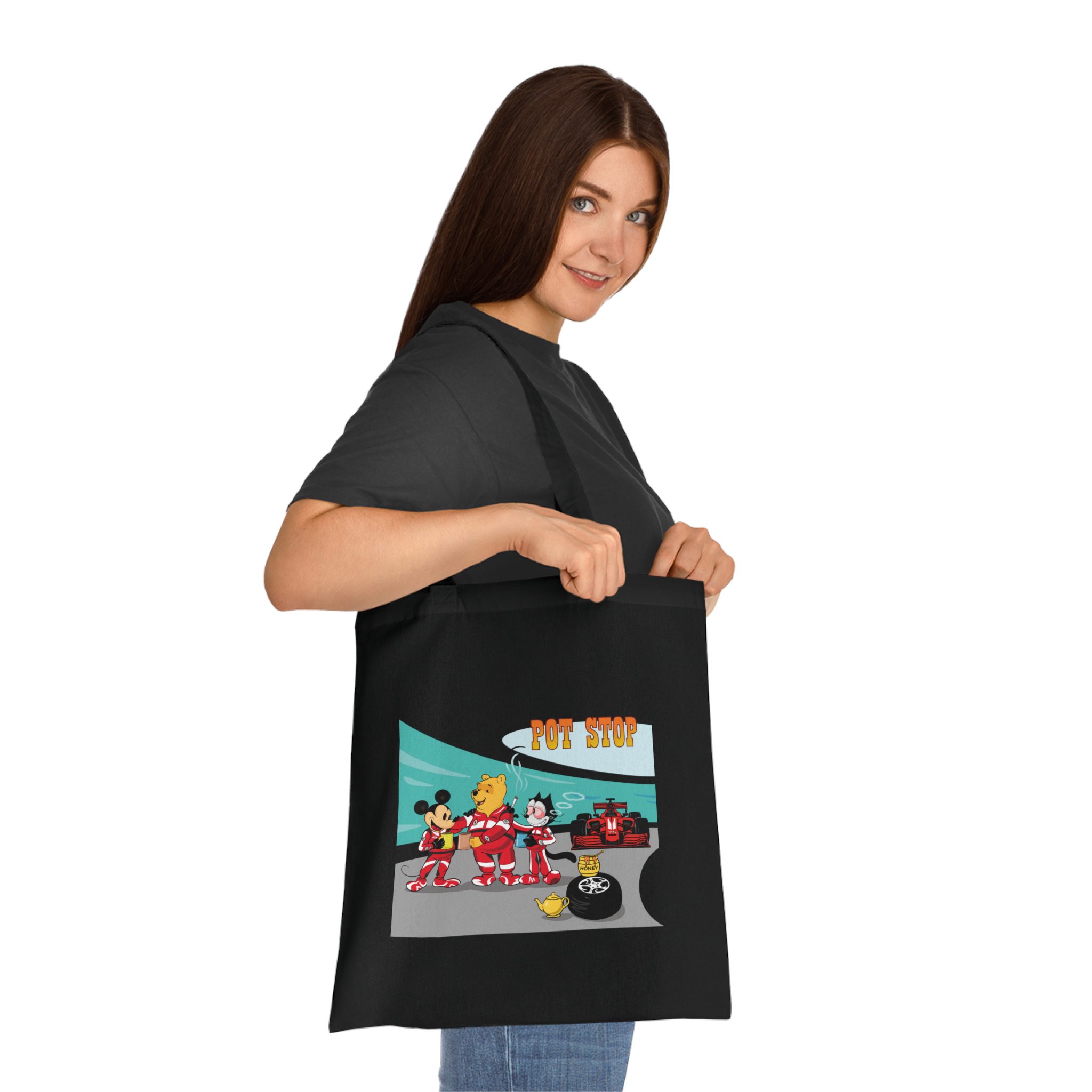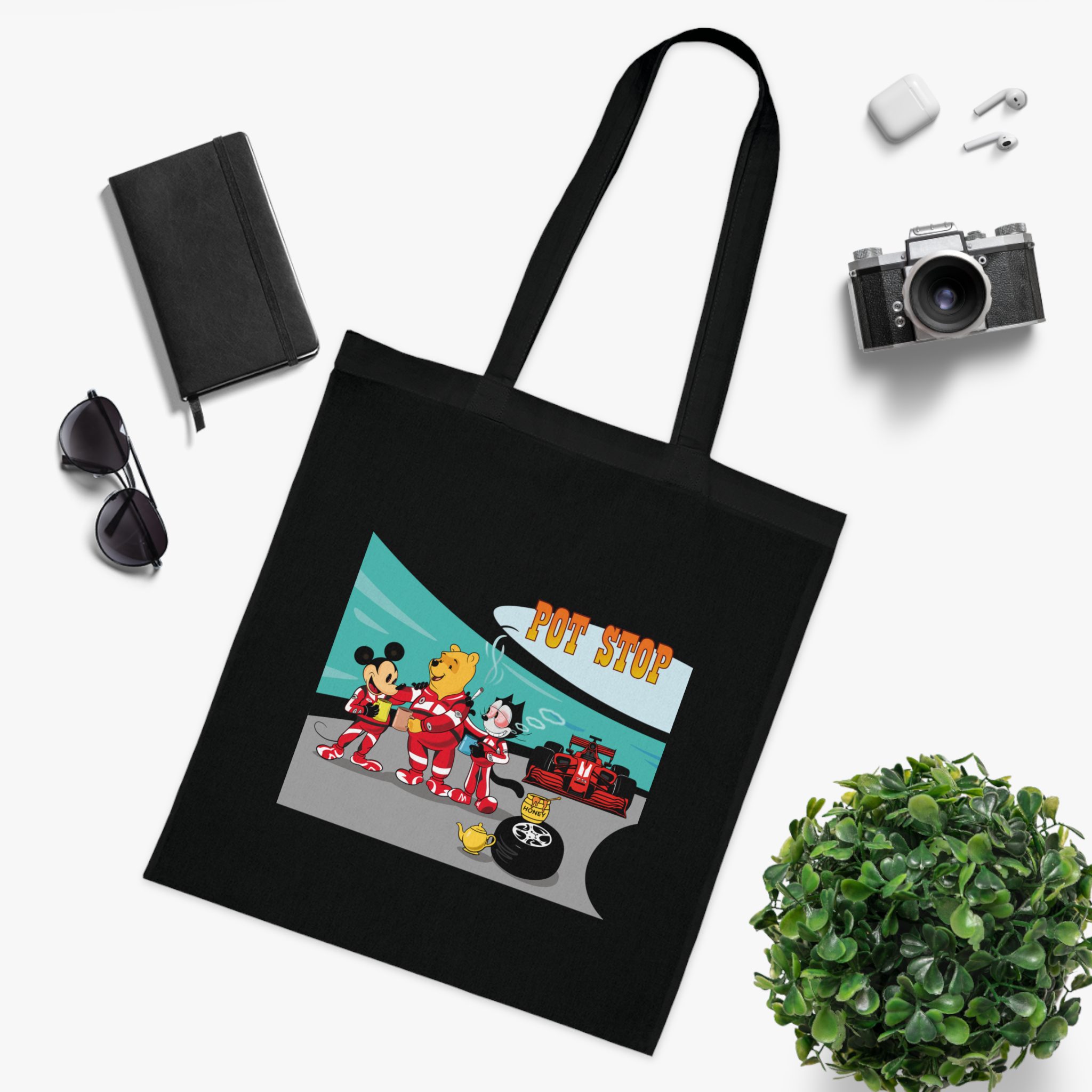 Playful Racing Pit Stop Art Tote Bag with Cozy Tea Break Scene