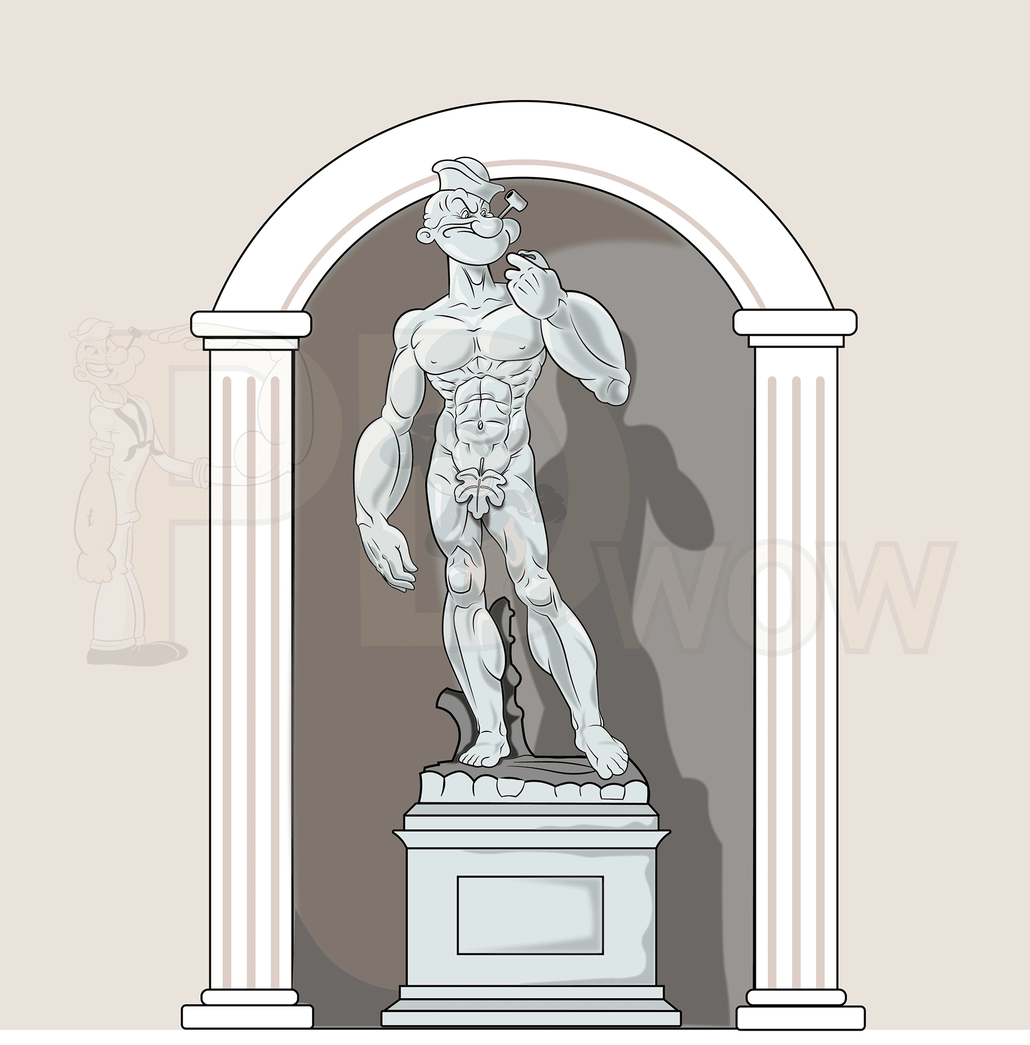This illustration blends classical art with playful cartoon energy. In this piece, the cartoon character steps into the iconic pose of a famous Renaissance sculpture. The result is a humorous and unexpected reinterpretation of a classical masterpiece. The illustrated character’s confident stance, exaggerated muscles, and familiar visual traits create a striking mix of high culture and comic charm.