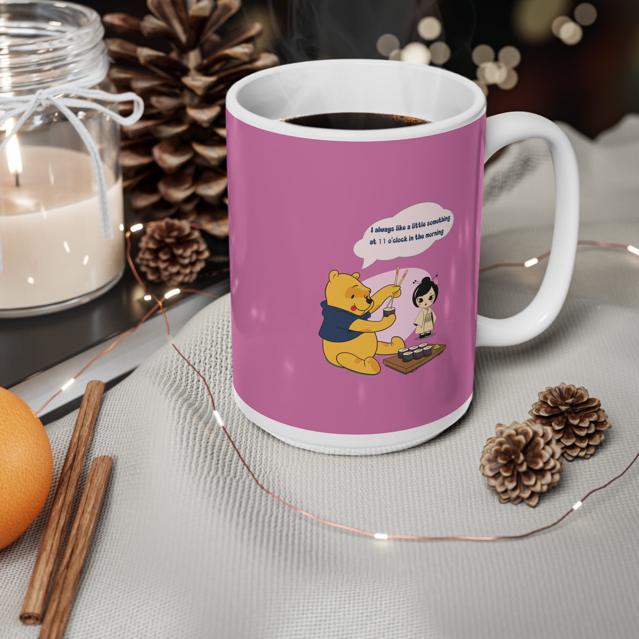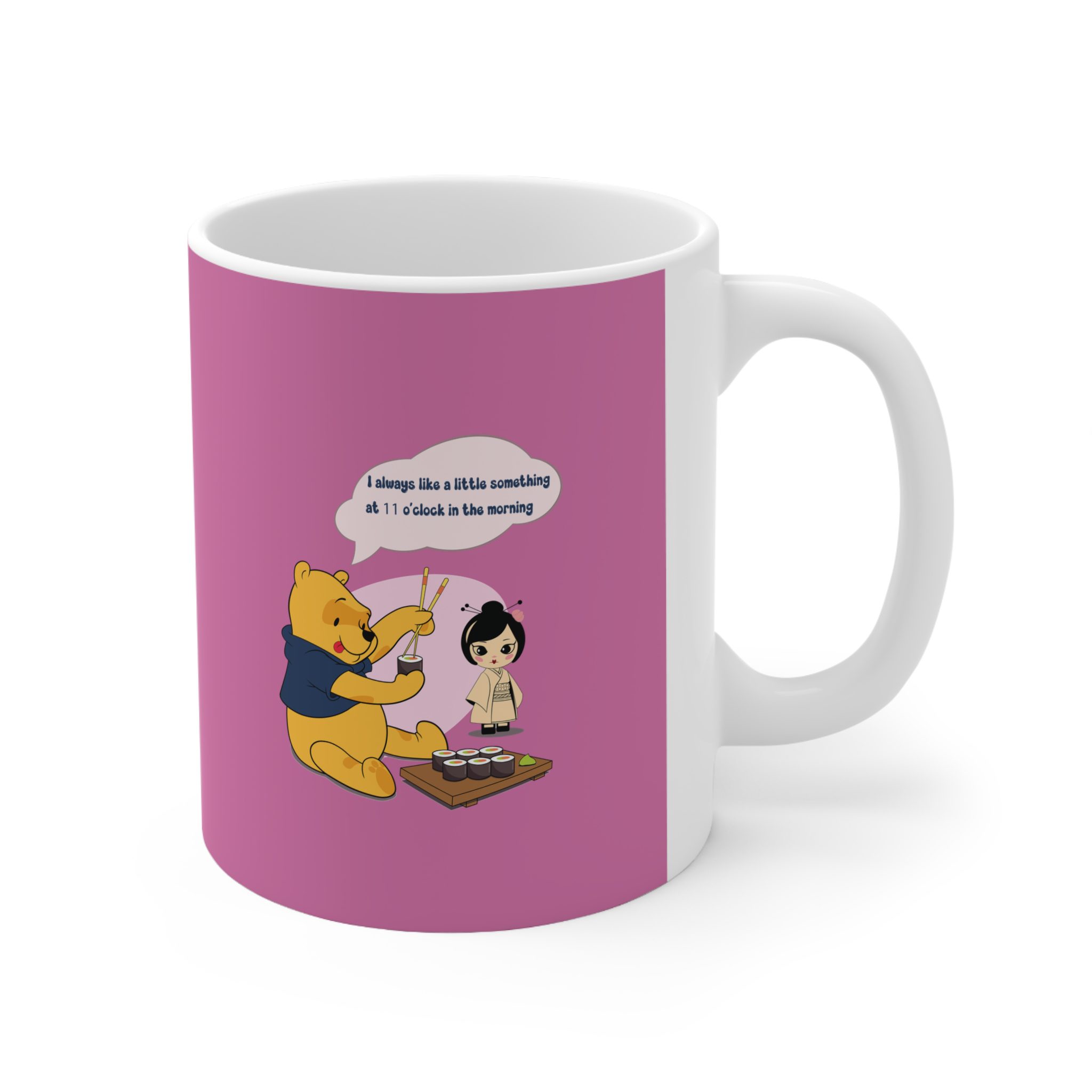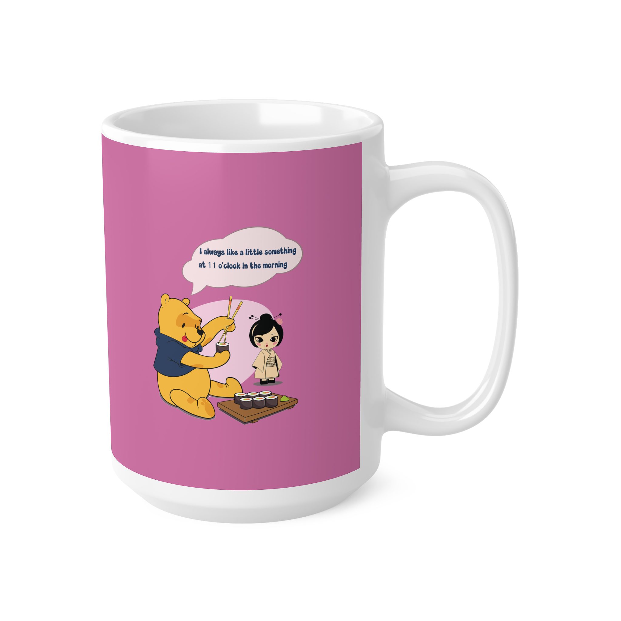 This cup showcases a Storybook Bear Character enjoying a quiet sushi moment filled with charm and gentle humor. Seated calmly with chopsticks in hand, the illustrated character brings together everyday joy and a playful cultural atmosphere.