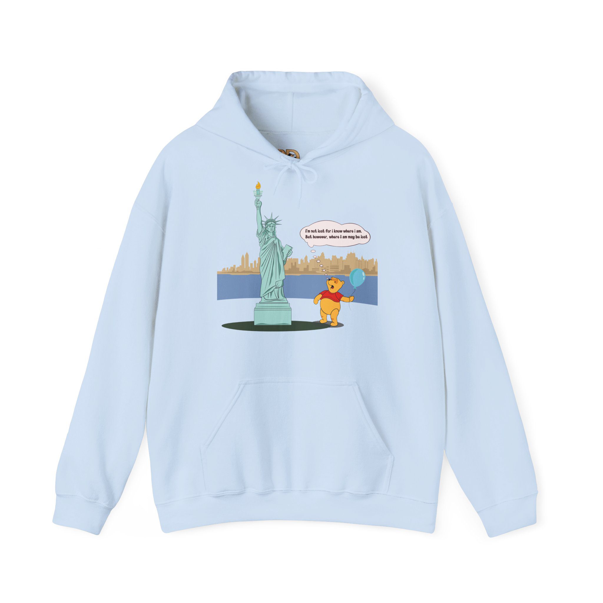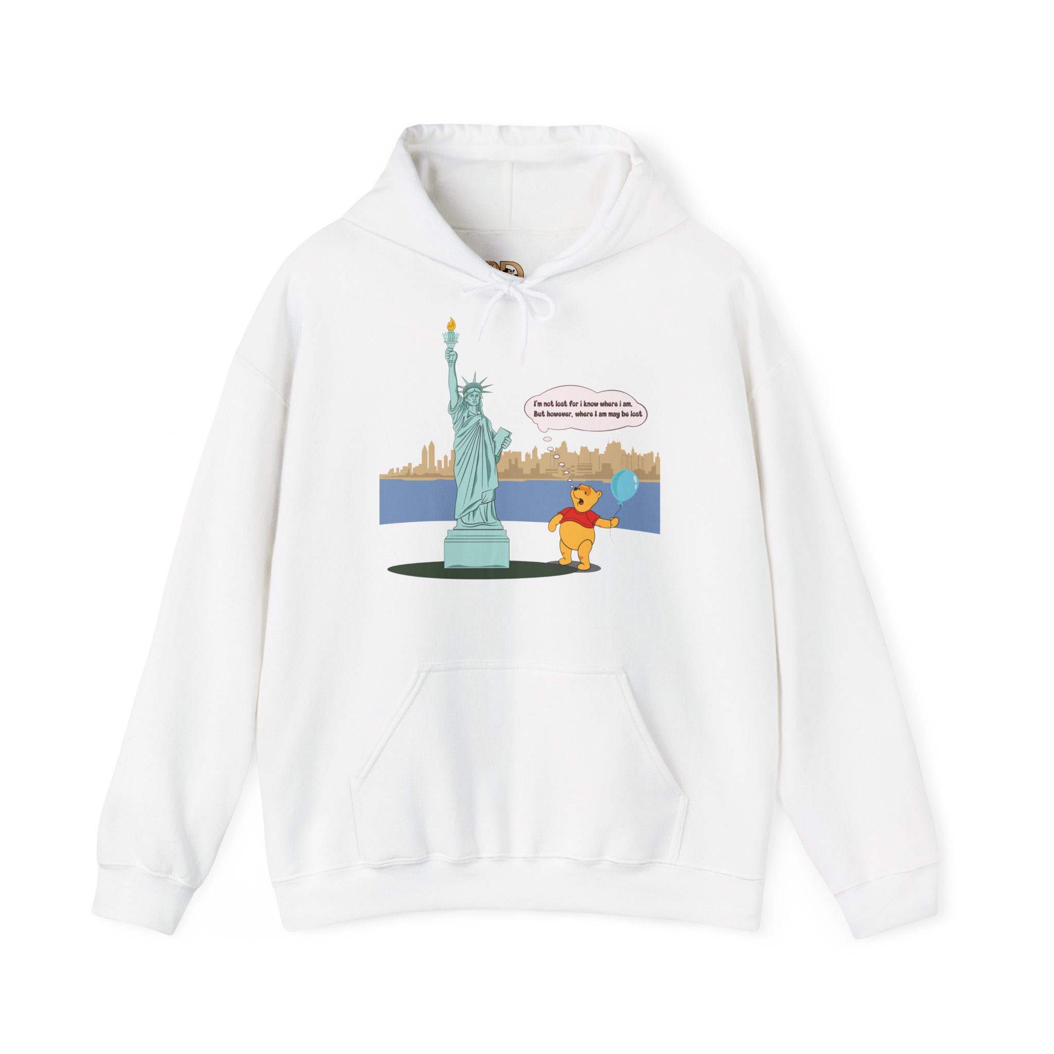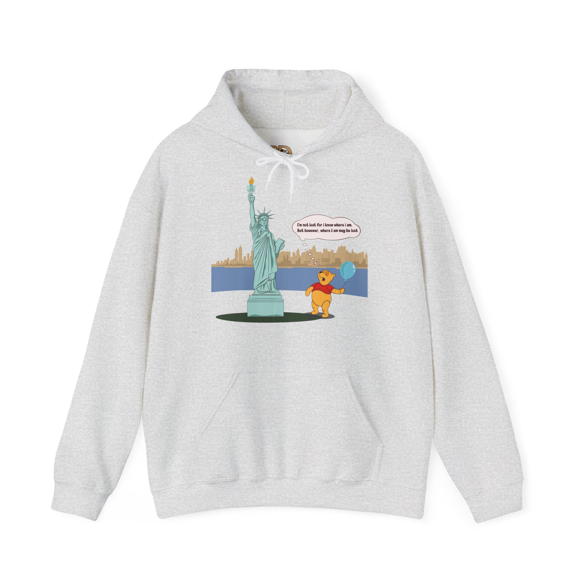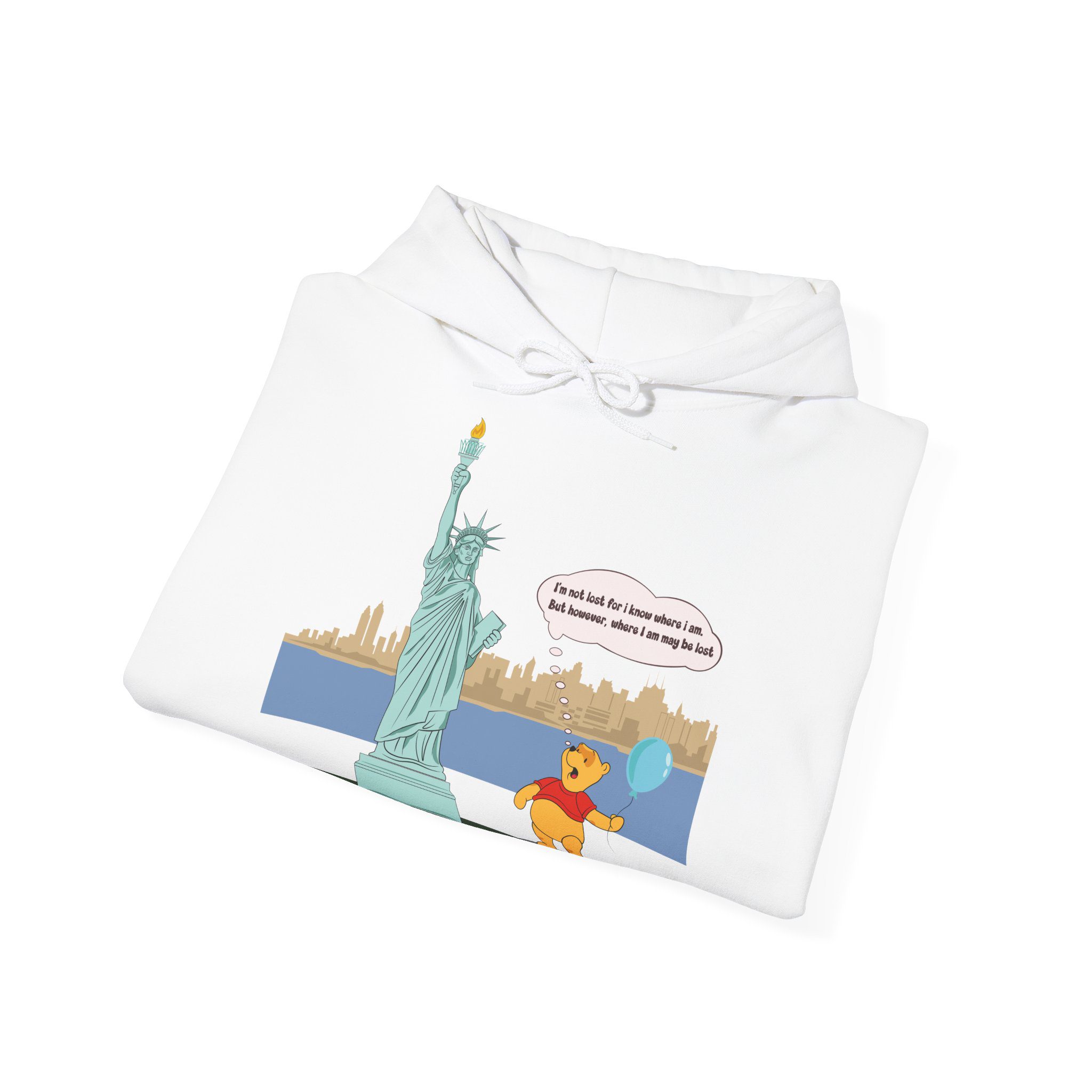 This hoodie features a gentle, cartoon-style bear standing quietly before a towering monument of freedom. With a balloon in hand and a thoughtful expression, the illustration captures a moment of pause, reflection, and soft humor that feels human and relatable.