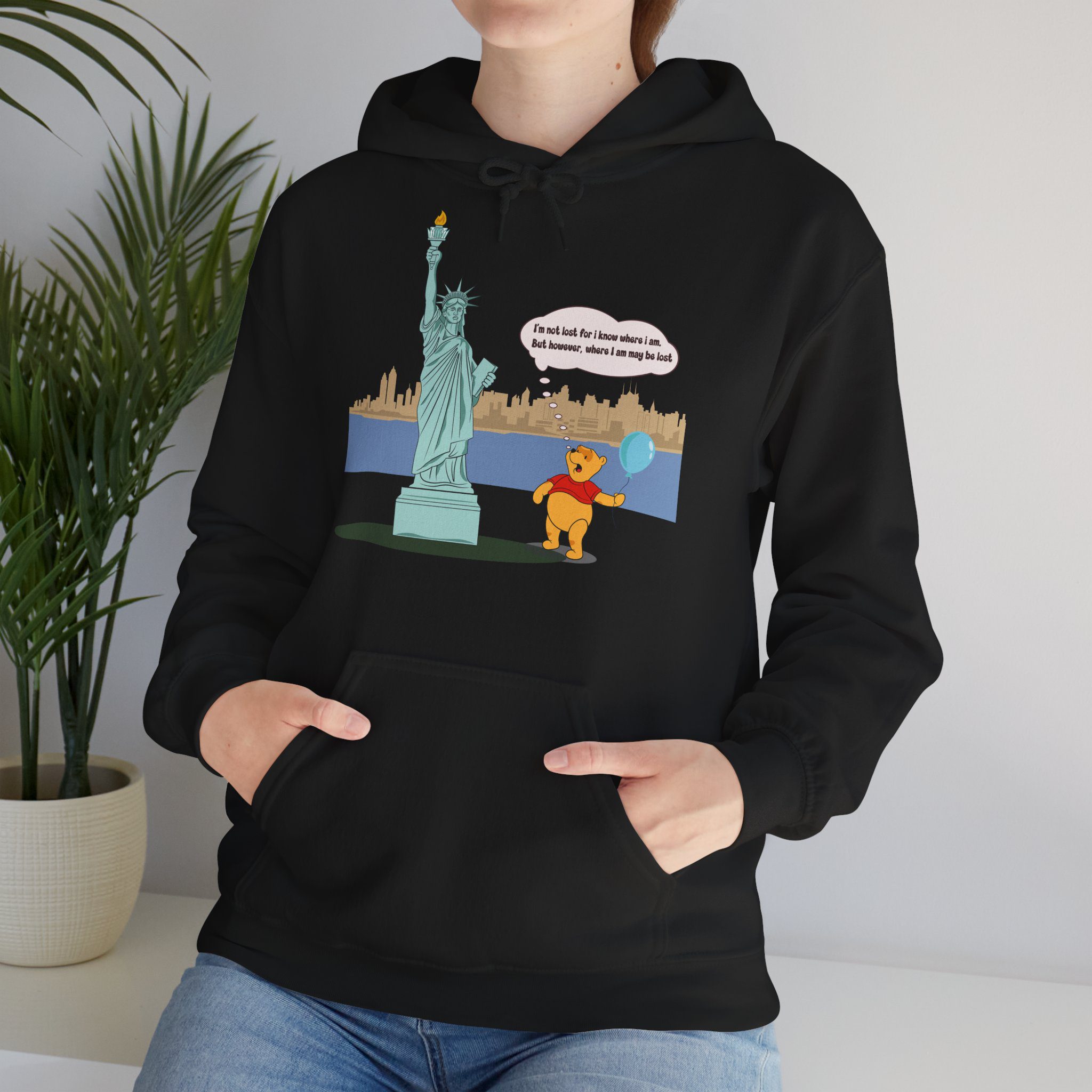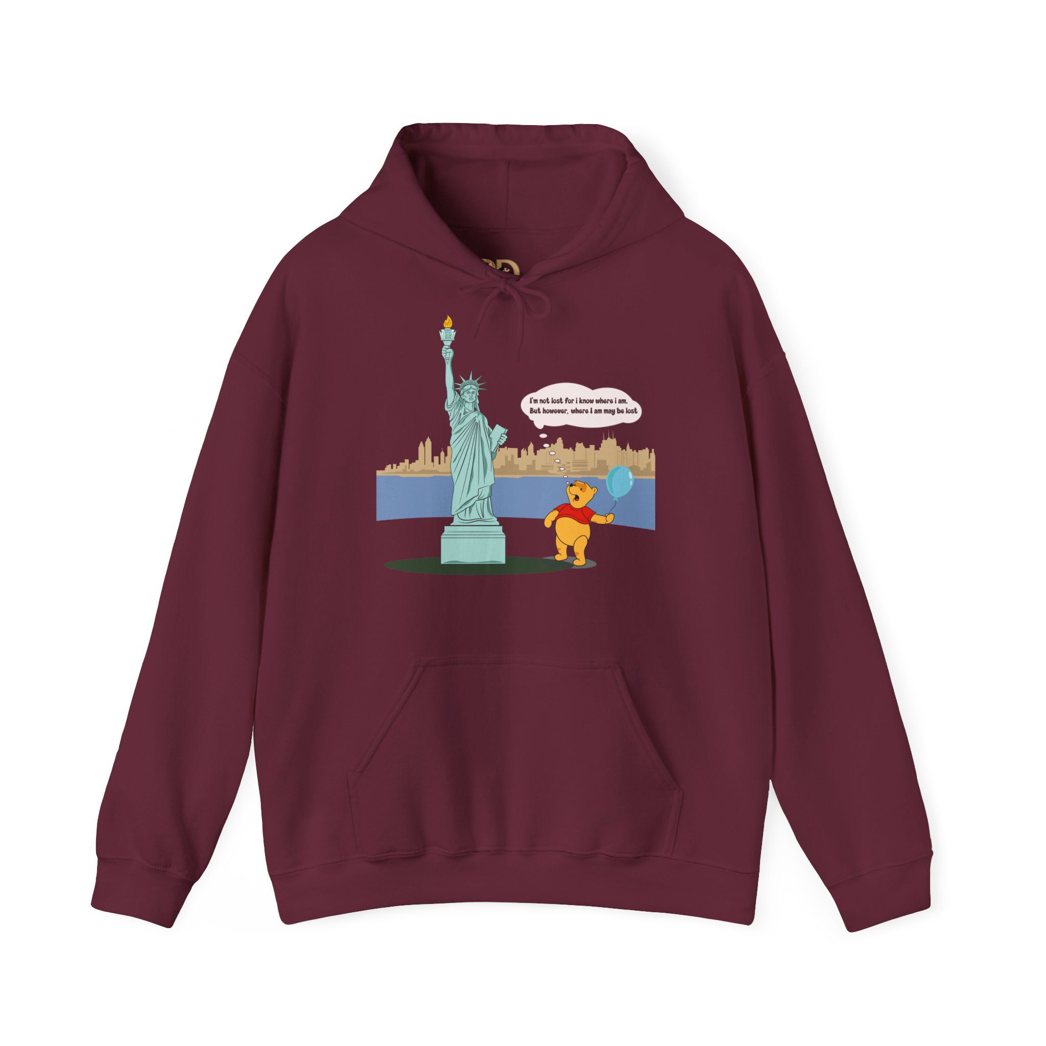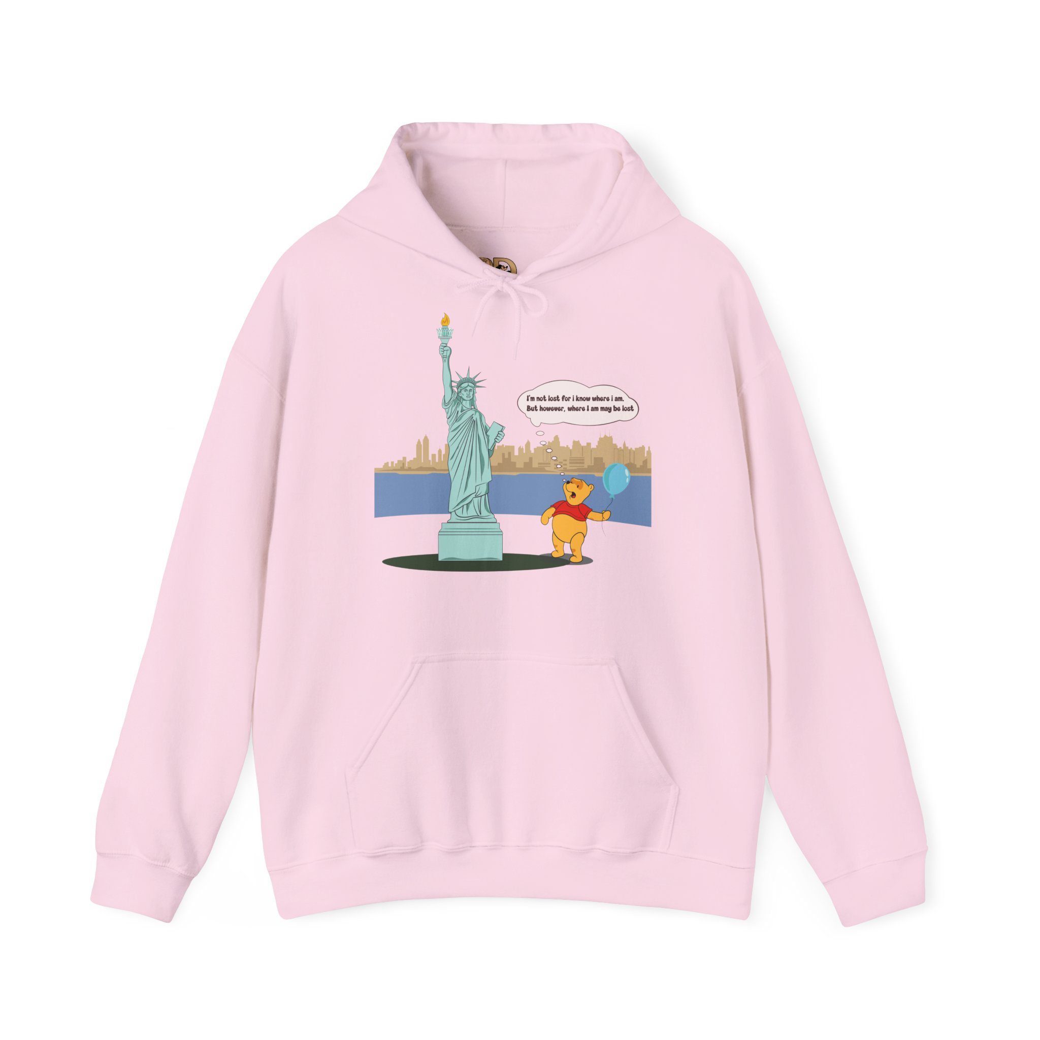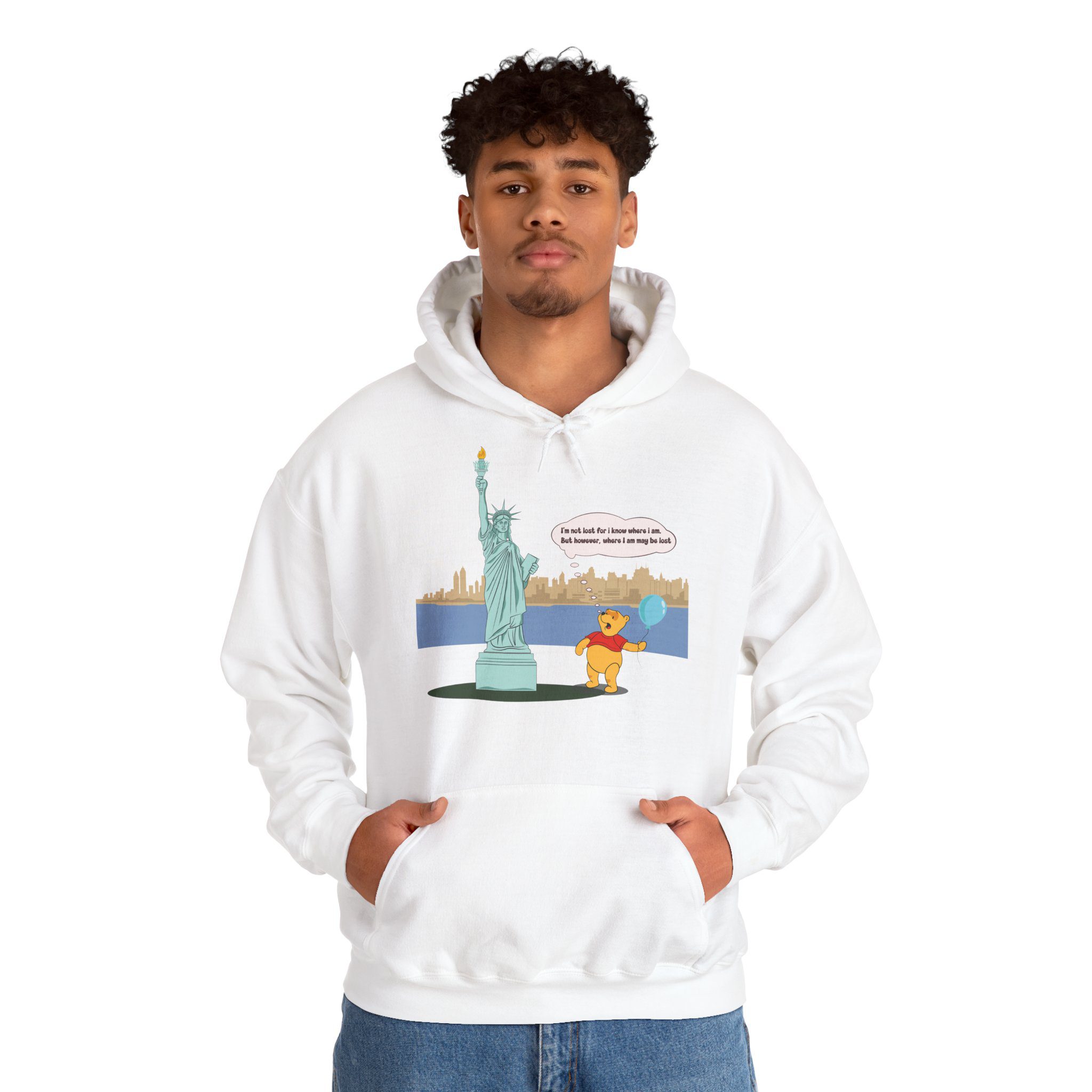 This hoodie features a gentle, cartoon-style bear standing quietly before a towering monument of freedom. With a balloon in hand and a thoughtful expression, the illustration captures a moment of pause, reflection, and soft humor that feels human and relatable.