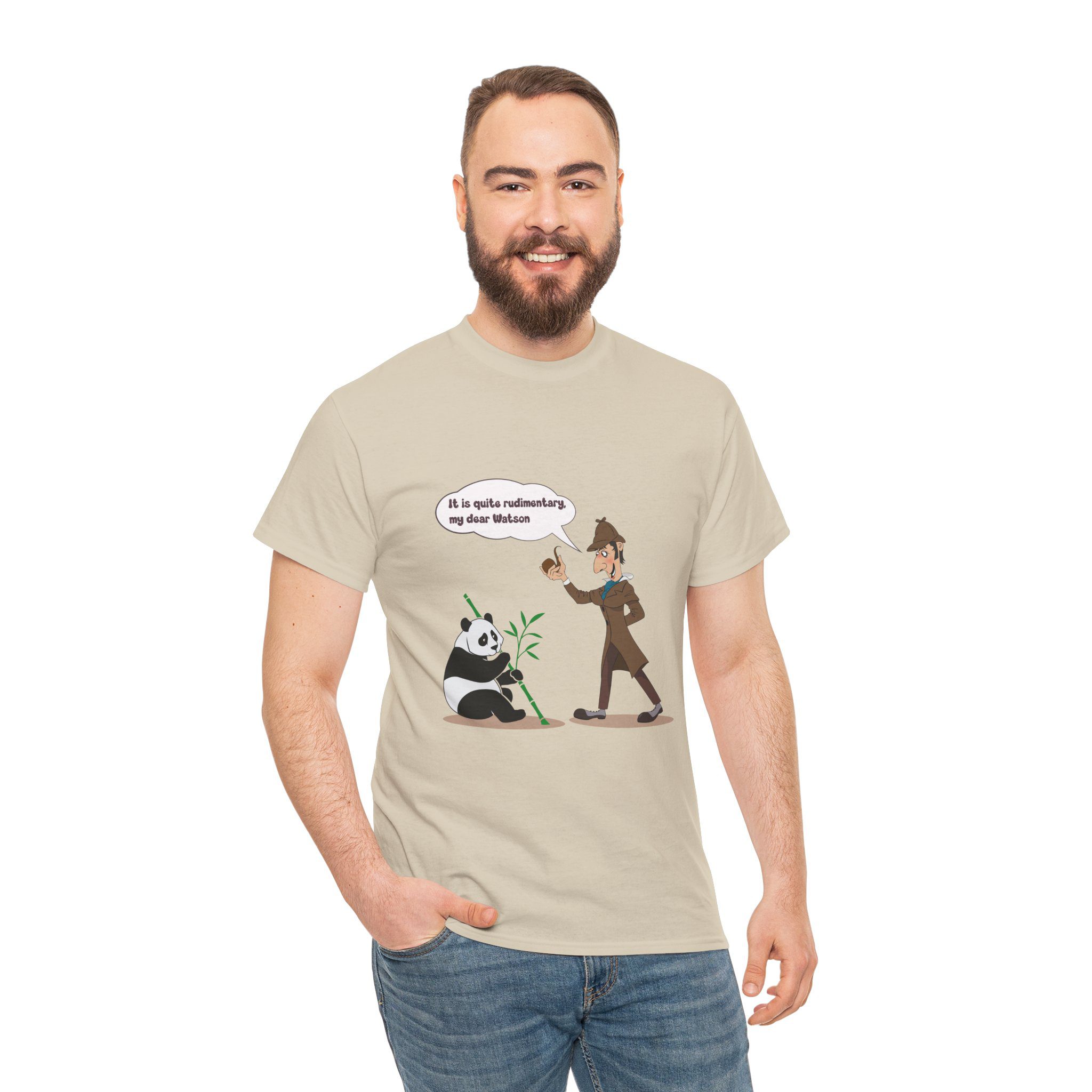 This design pairs a calm, thoughtful illustrated figure with a relaxed panda enjoying a quiet moment. The contrast between focused contemplation and effortless calm creates gentle humor, turning stillness into a charming visual story about balance and perspective.