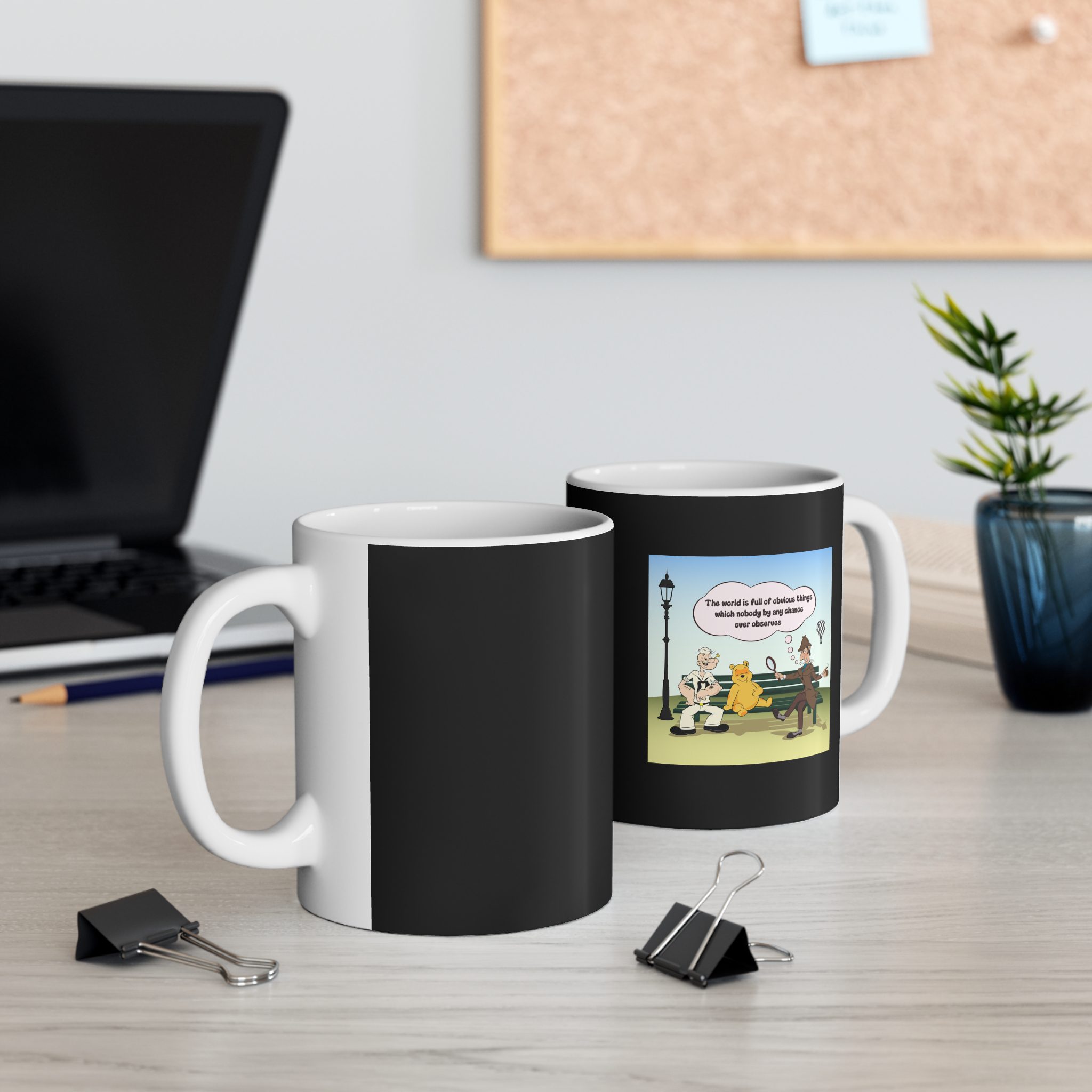 This mug captures a reflective moment where contrasting personalities share the same quiet space. A thinker, a strong presence, and a calm observer sit side by side, turning an ordinary park bench into a stage for silent philosophy and gentle irony.