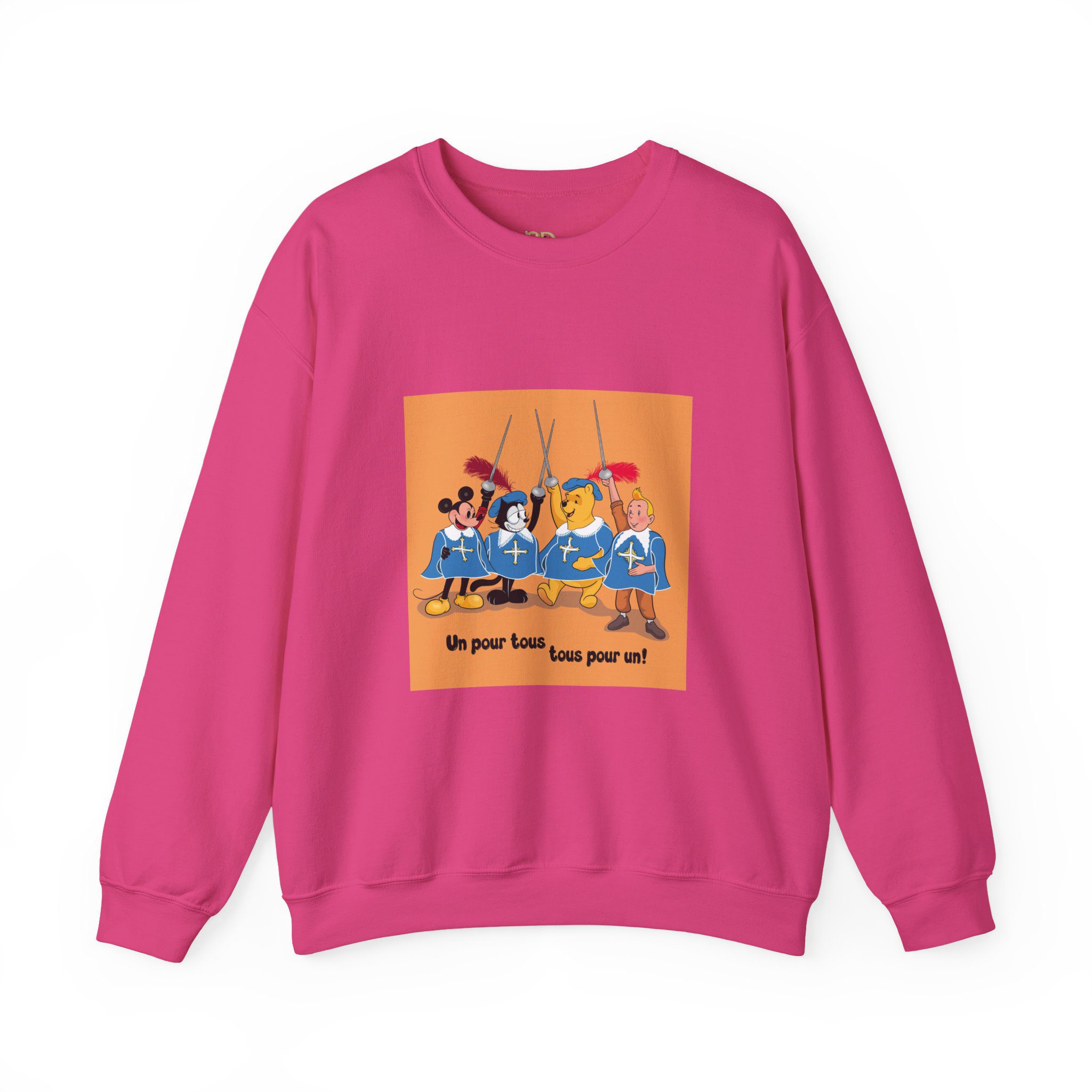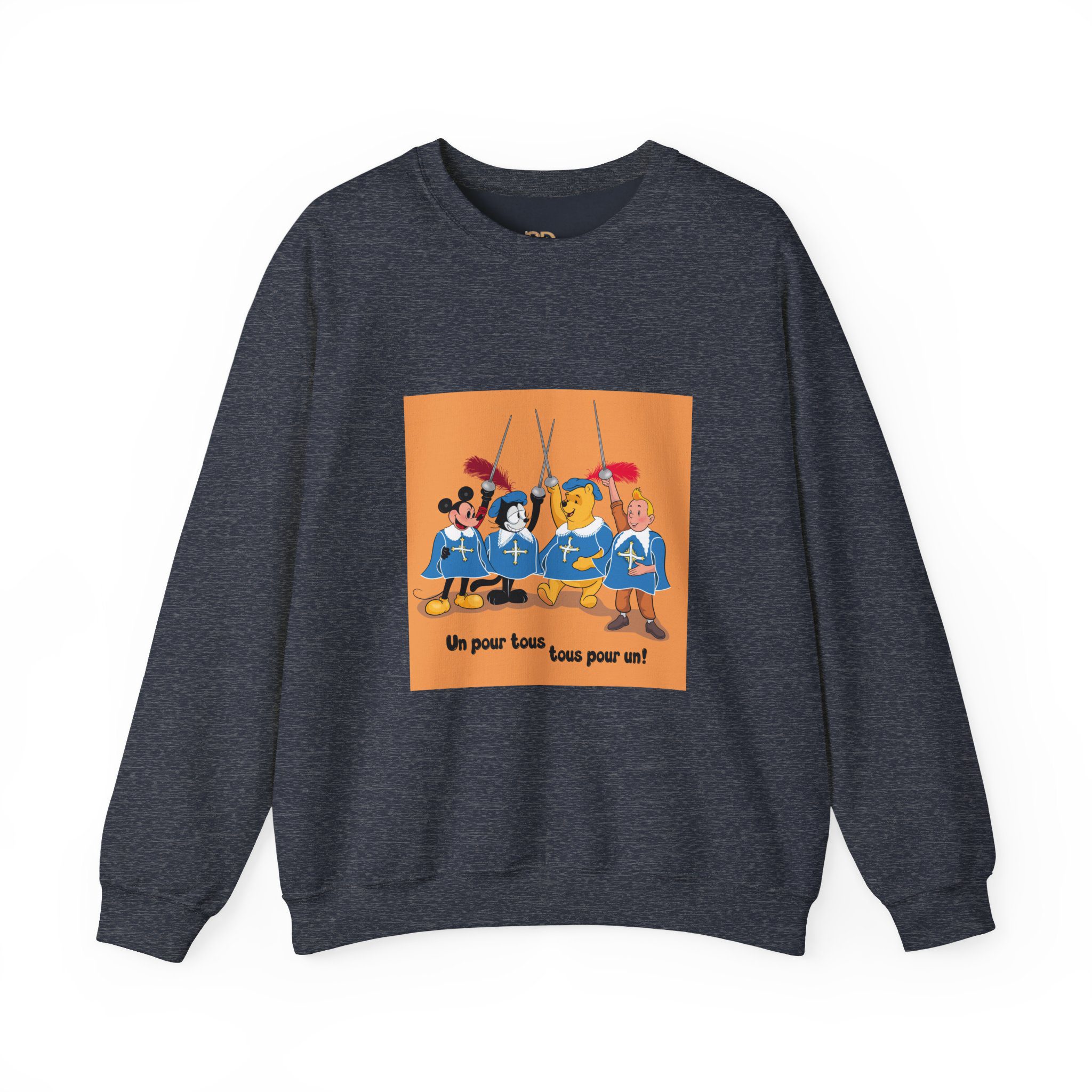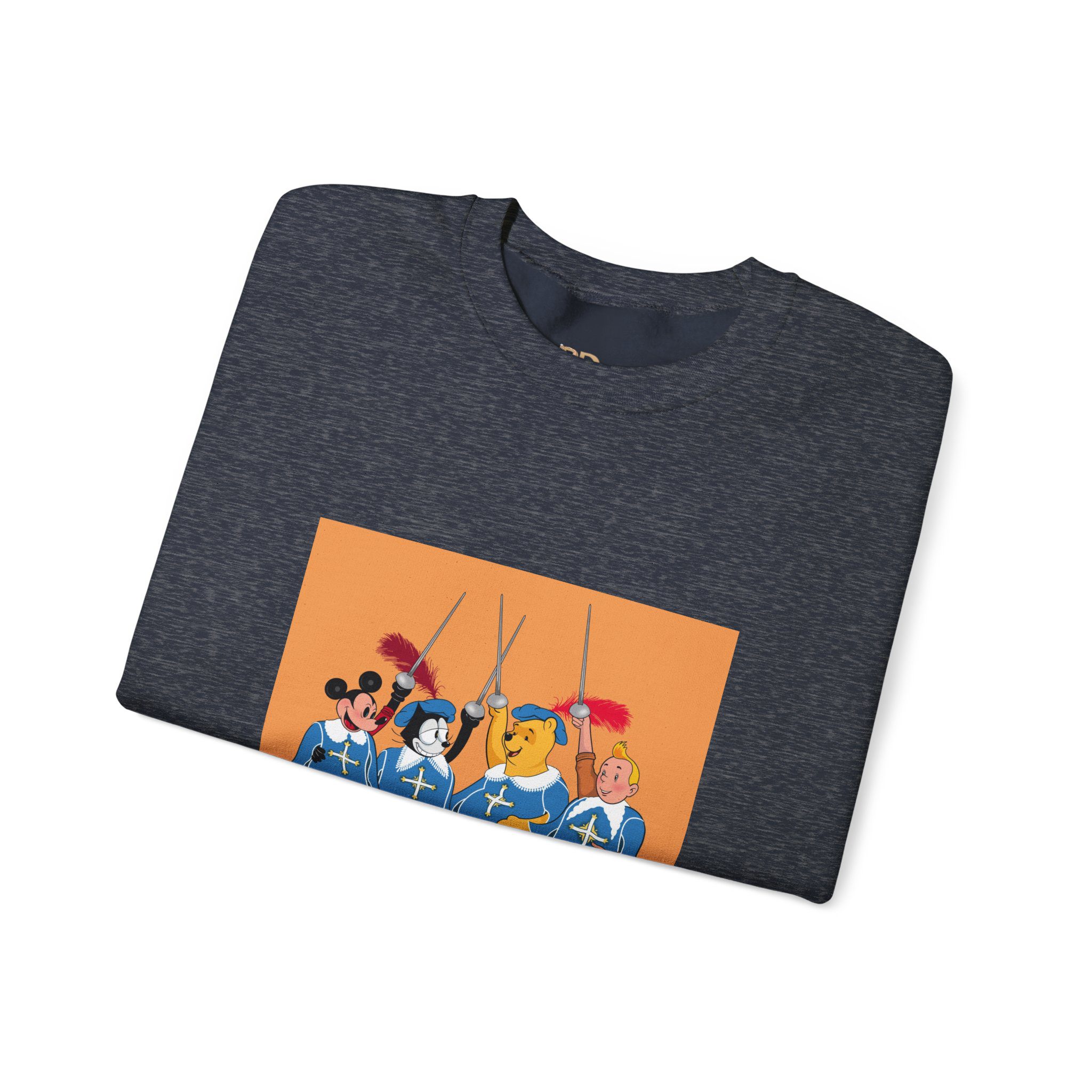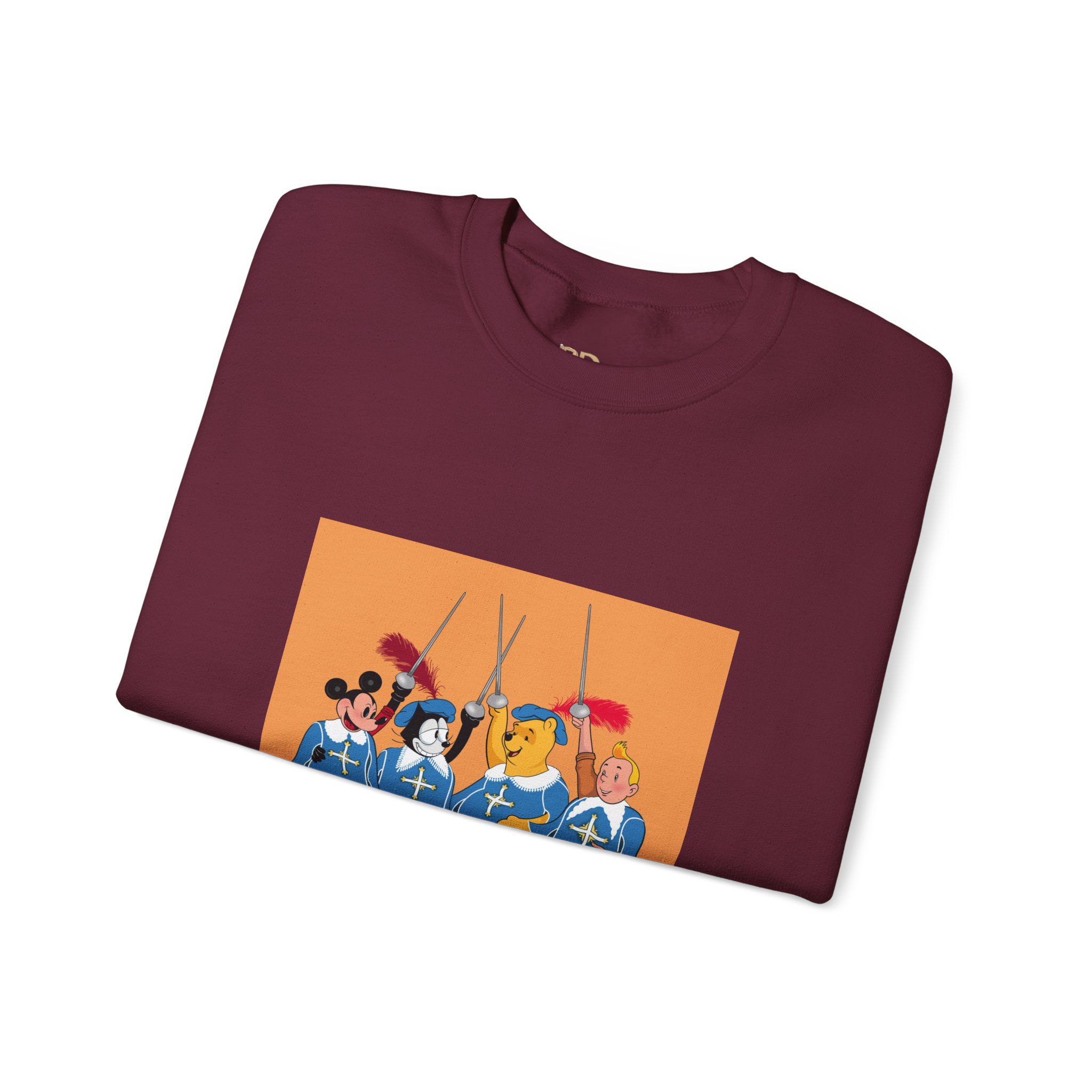 This sweatshirt celebrates classic heroism through a group of animated adventurer archetypes brought together by courage, loyalty, and friendship. The artwork channels the timeless spirit of swashbuckling tales, turning unity and bravery into a warm, feel-good visual story.